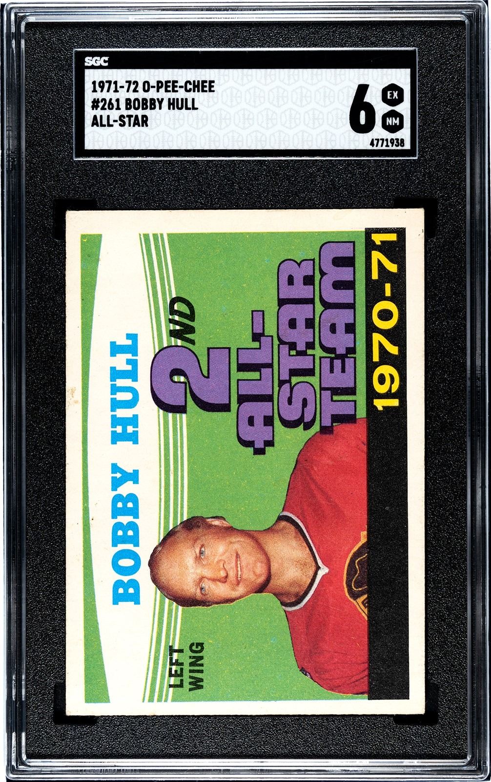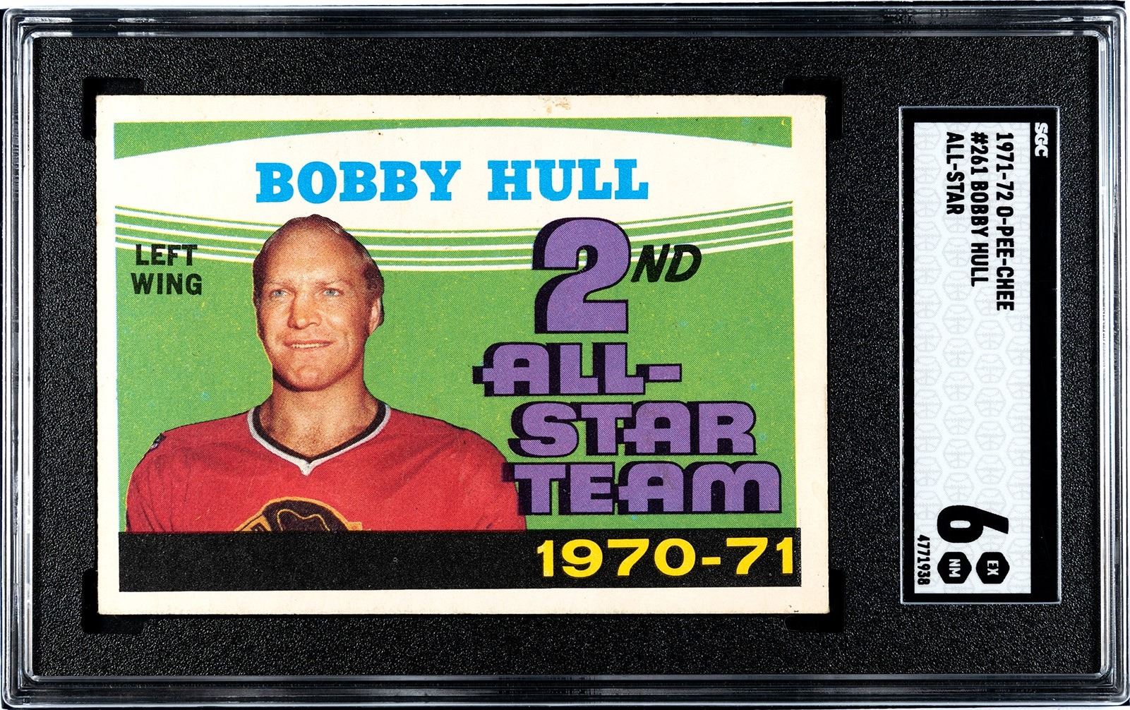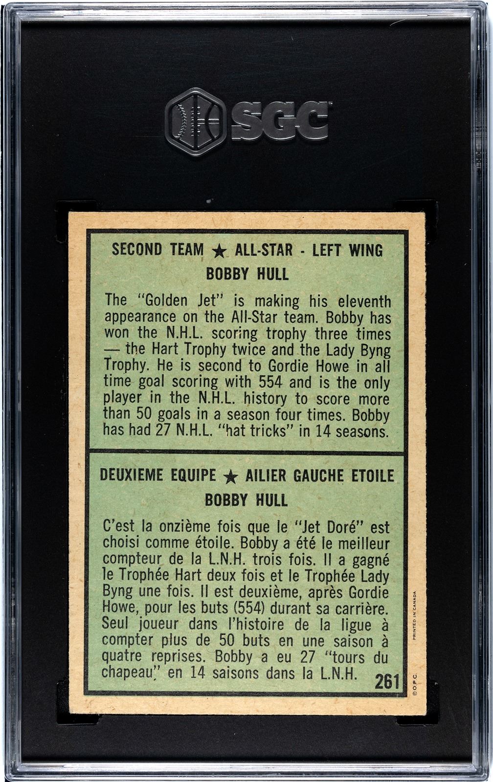 HOFer Hull's impact on the ice is undeniable: 610 goals (913 including WHA games), 10 1st All-Star selections, 3x scoring leader, 7x goals leader, 2x MVP, and 1,170 NHL points in 1,063 games. Graded 6 EX-NM by SGC!