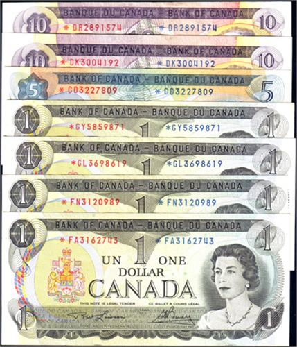 Bank of Canada One Dollar 1973, Lawson-Bouey, BC-46aA, four notes, Serial Numbers *FA3162743, EF, *FN3120989, VF-EF, *GL3698619, VF-EF and *GY5859871, F-VF. Plus Five Dollars 1972, Bouey-Rasminski, BC-48aA *CD3227809, VF and Ten Dollars 1971, Bouey-Rasminski, BC-49bA *DK3004192, EF and *DR2891574, VF. A total of seven replacement notes