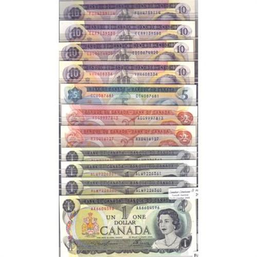 1973 One Dollar, BC-46a and three consecutive BC-46b. Plus 1974 Two Dollars, BC-47a and BC-47a-i. Plus 1972 Five Dollars, BC-48a. Plus 1971 Ten Dollars, BC-49c, BC-49c-I, BC-49d and BC-49e. Total eleven notes, all Uncirculated