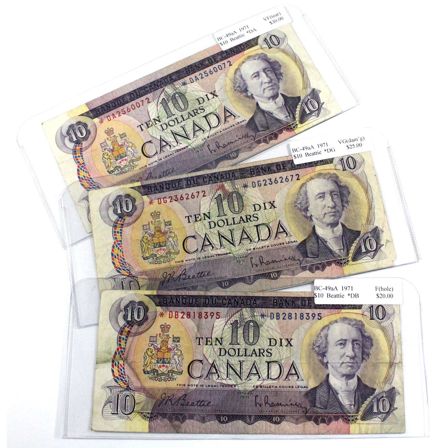 1971 BC-49aA $10 Bank of Canada Replacement Notes with Beattie-Rasminsky Signatures and Different Prefixes - *DA (VF), *DB (Fine) & *DG (VG). Notes contain various impairments. 3pcs