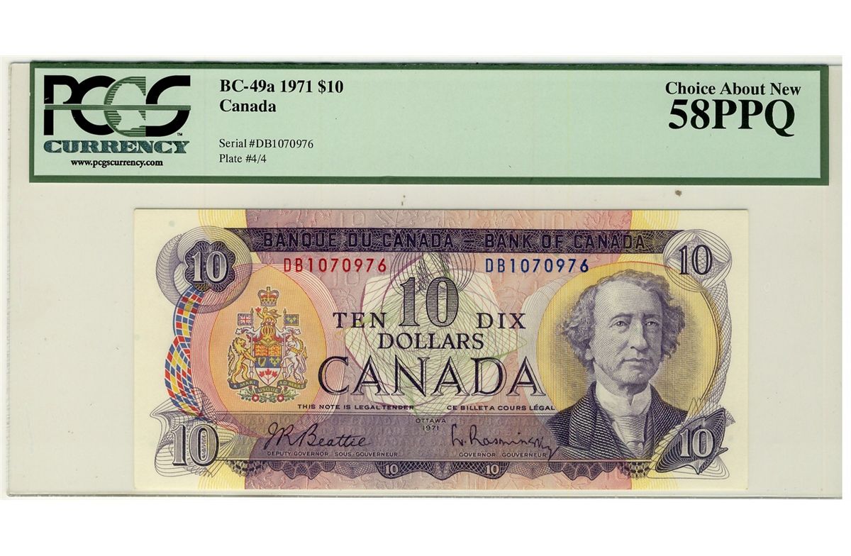 1971 Bank of Canada; 10 Dollars, 0 BC-49a #DB1070976 PCGS CH AU58PPQ.