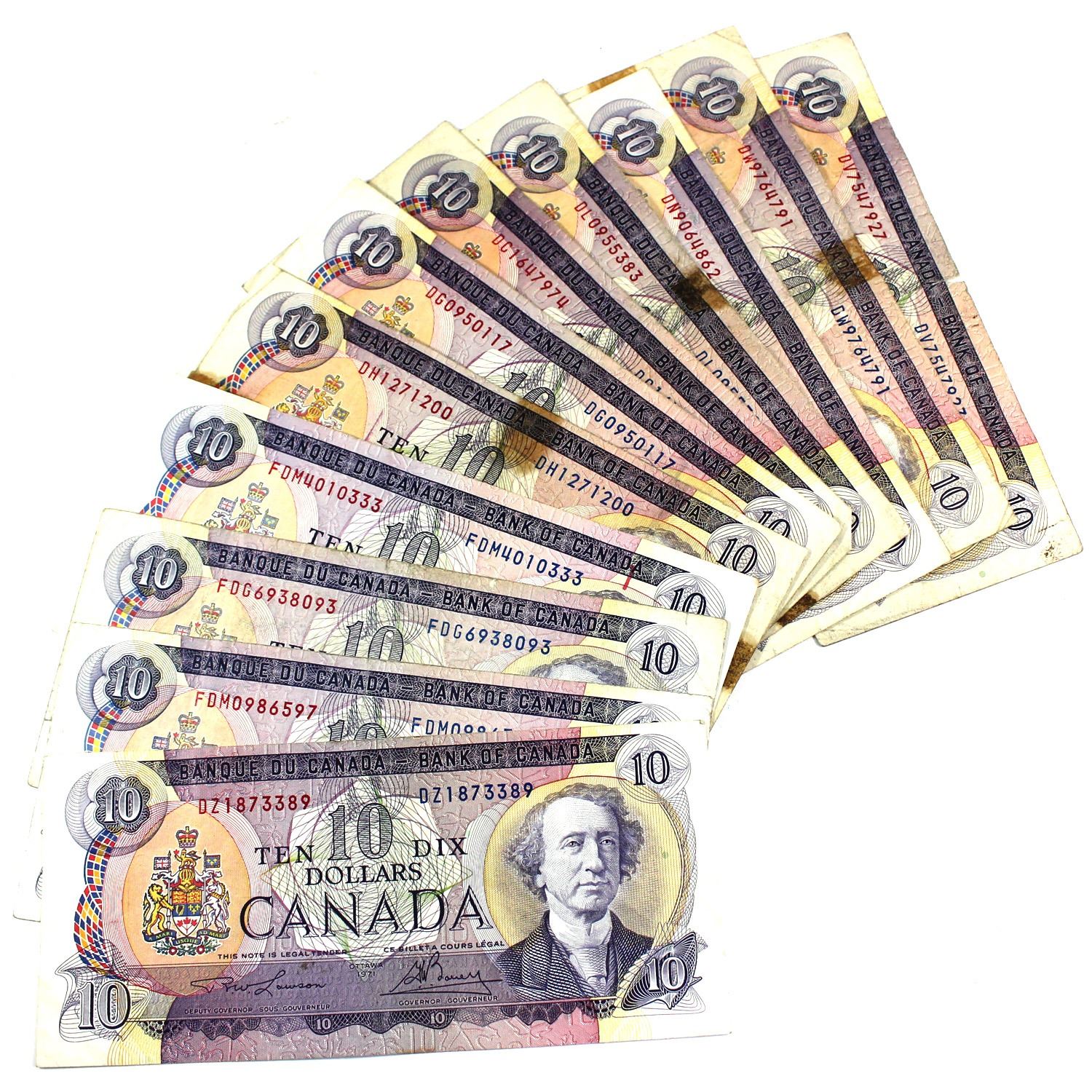 1971 Bank of Canada $10 Notes with 1x Lawson-Bouey, 4x Bouey-Rasminsky, 4x Beattie-Rasminsky & 3x Thiessen-Crow. Notes may contain impairments. 12pcs
