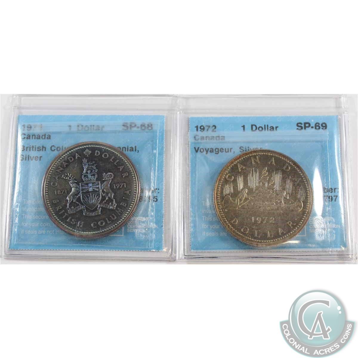 1971 Canada Silver $1 British Columbia Centennial CCCS Certified SP-68 & 1972 Voyageur SP-69. Both coins have nice rainbow toning. 2pcs