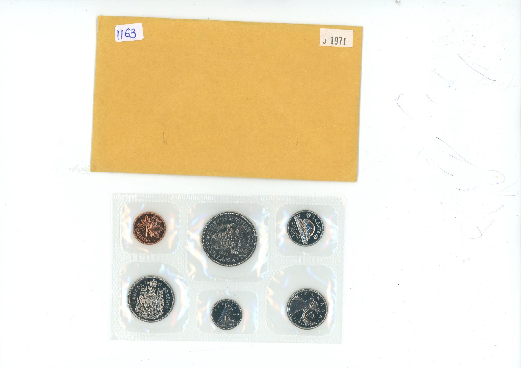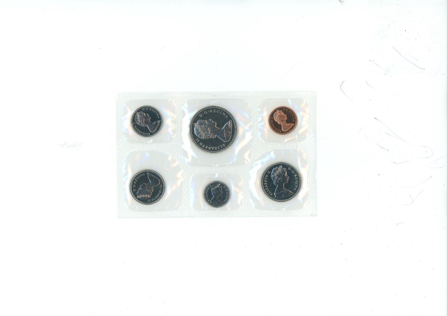 1971 Canadian Proof Like Set. 6-coin set with the dollar commemorating the 100th Anniversary of British Columbia joining Canada. 2 coins have Cameos.
