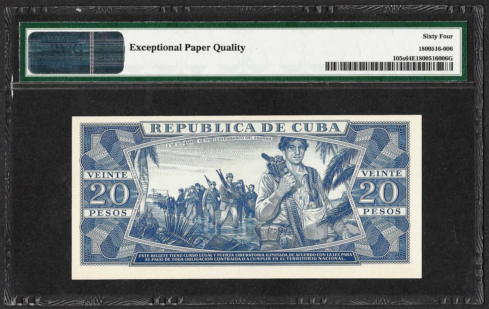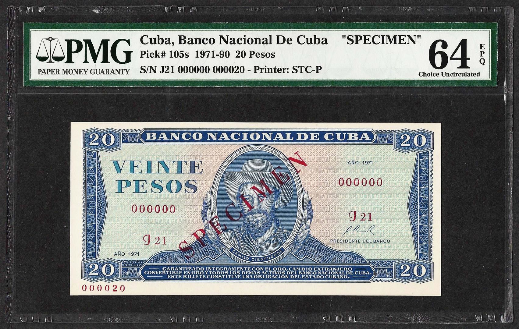 One 1971 Cuba 20 Pesos National Bank of Cuba Specimen Note PMG Choice Uncirculated 64EPQ. PMG Certified.