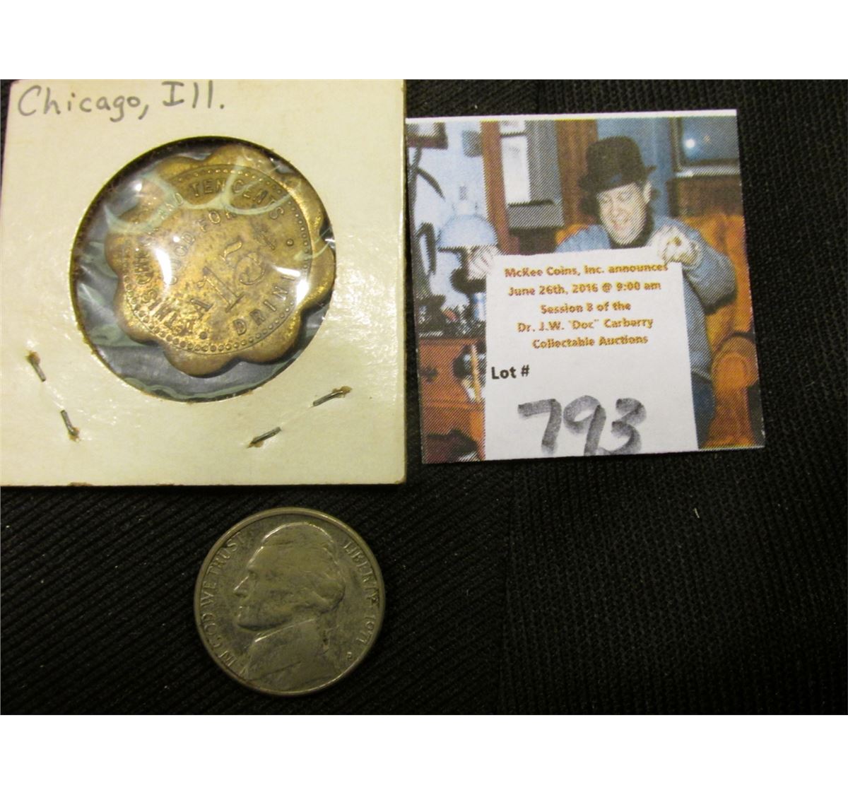 1971 D Jefferson Nickel Counterstamped "JWC", which was 'Doc's initials, according to an attached note this was actually a JWC Café token; & "Carberry's/63rd and/Halsted/City", "This Check and Ten Cents/Good For/15c/Drink" (was 'Doc' that tight??? This last token he says was from Chicago.
