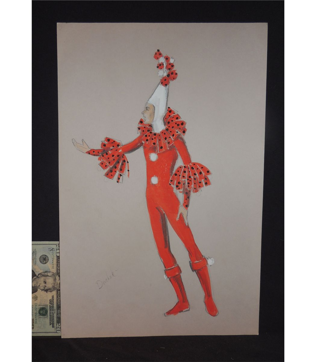 This one is the red and white clown wardrobe for the Pinocchio stage performances. This has a pencil note by the artist. It is unclear if it is a signature or the character's name. On the back is a sticker with the number 13.