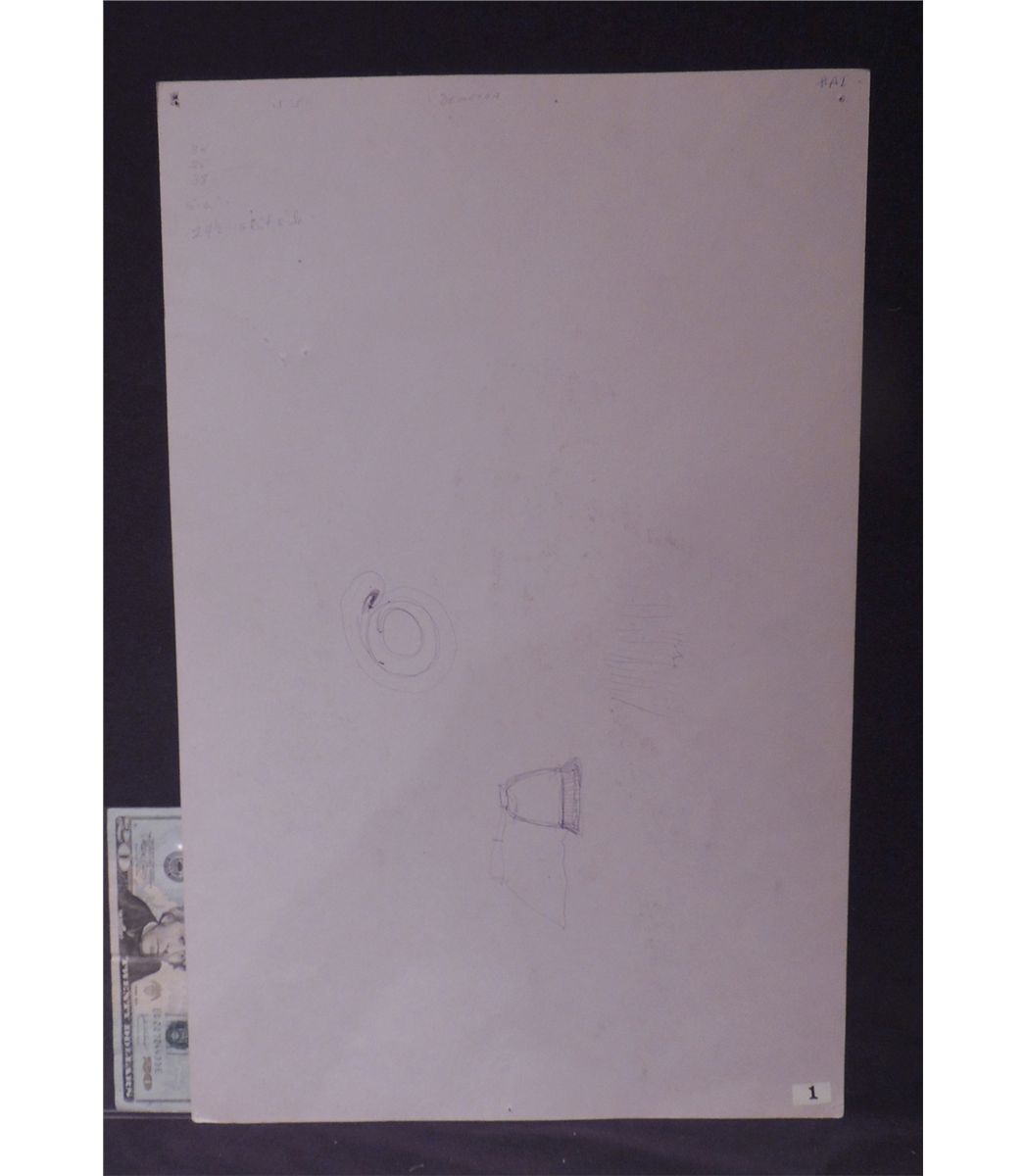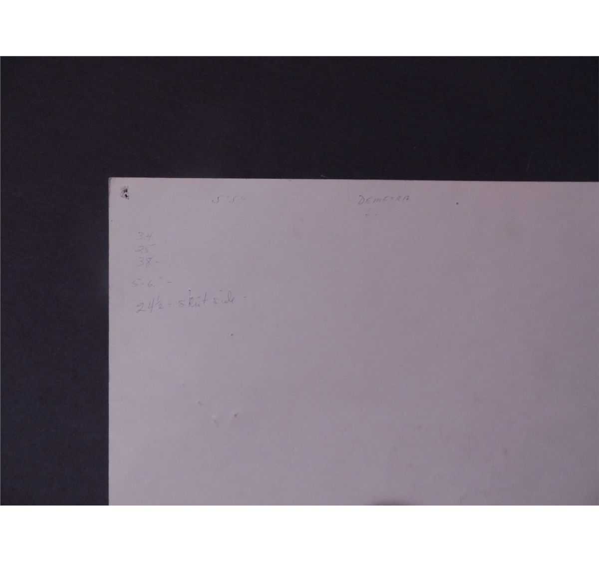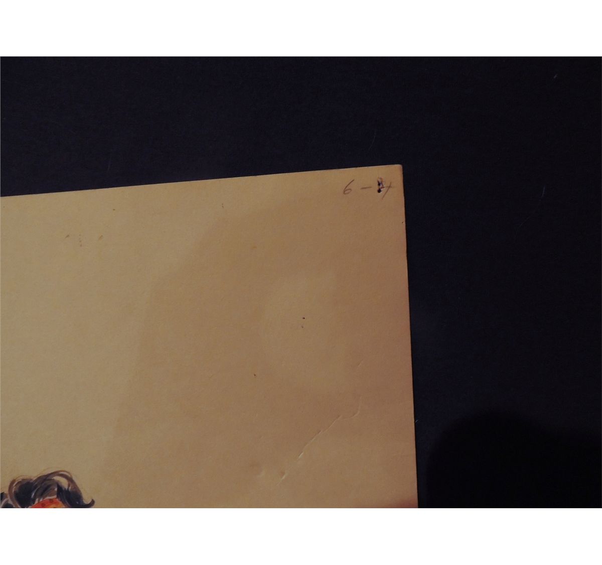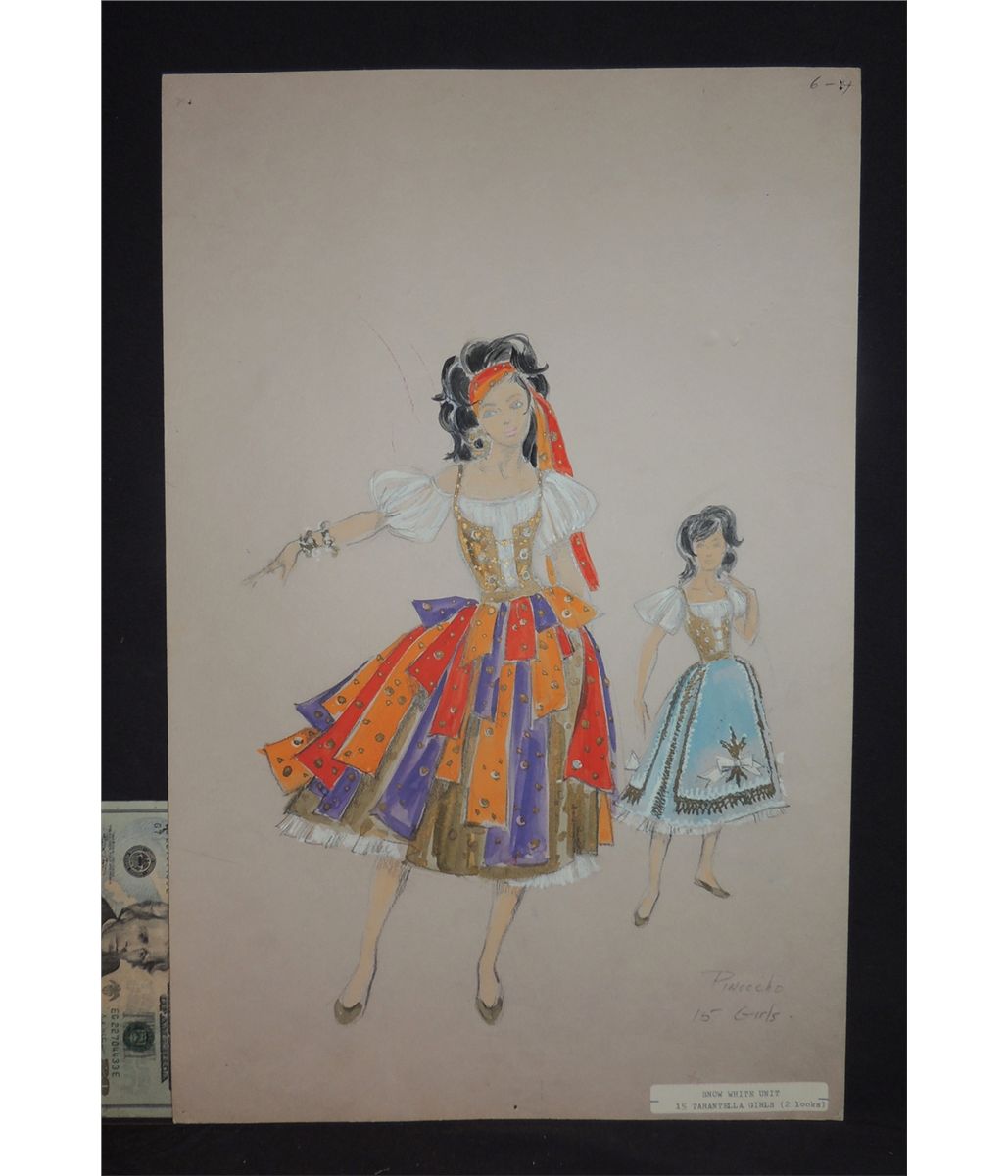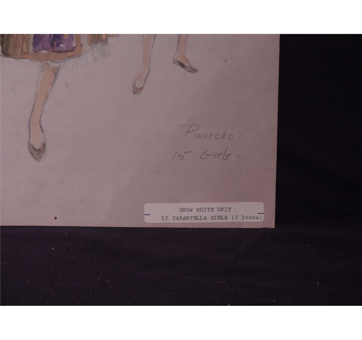 This one is of two different dresses for the Pinnochio and Snow White stage performance according to the pencil notes. Possibly one from each? It also has the #1 sticker which seems to go with at least 2 other artworks in this collection. This has the main artwork, but also a smaller scale full color secondary artwork of another design. On back there are several notes and sketches. This one piece has a lot to offer. There are pin holes at top.