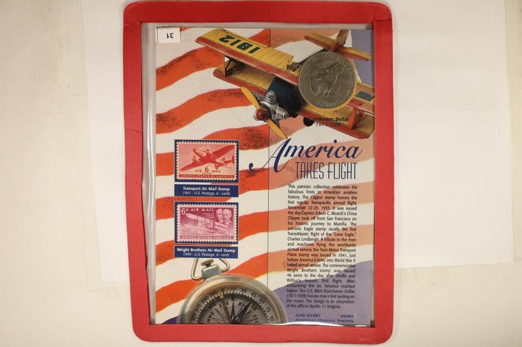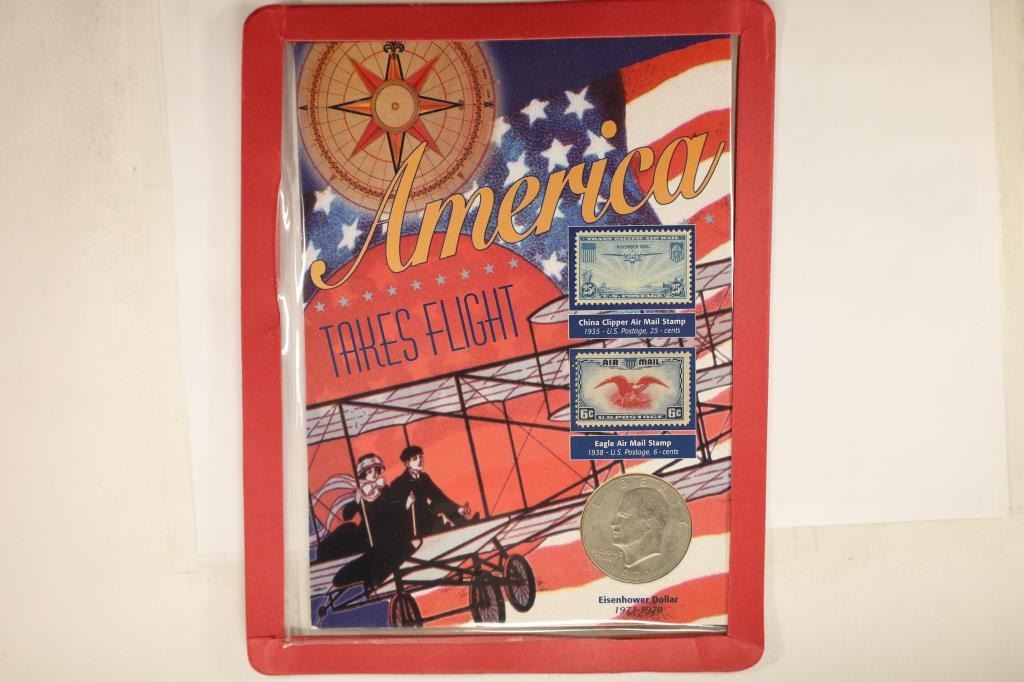 INCLUDES CHINA CLIPPER AIR MAIL STAMP, EAGLE AIR MAIL STAMP, TRANSPORT AIR MAIL STAMP AND WRIGHT BROTHERS AIR MAIL IN AMERICAN HISTORICAL SOCIETY PACKAGING