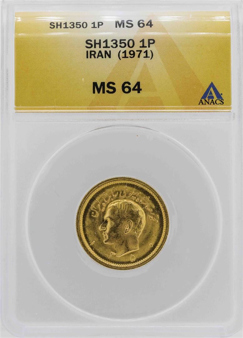 One 1971 Iran Pahlavi SH1350 Gold Coin ANACS MS64. ANACS Certified.