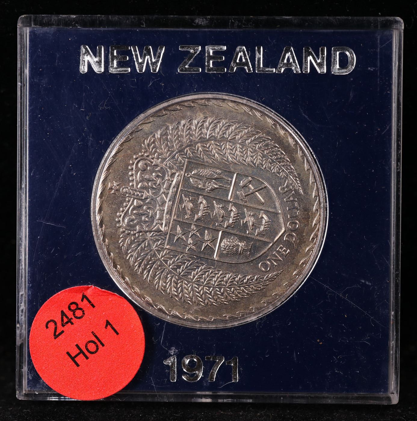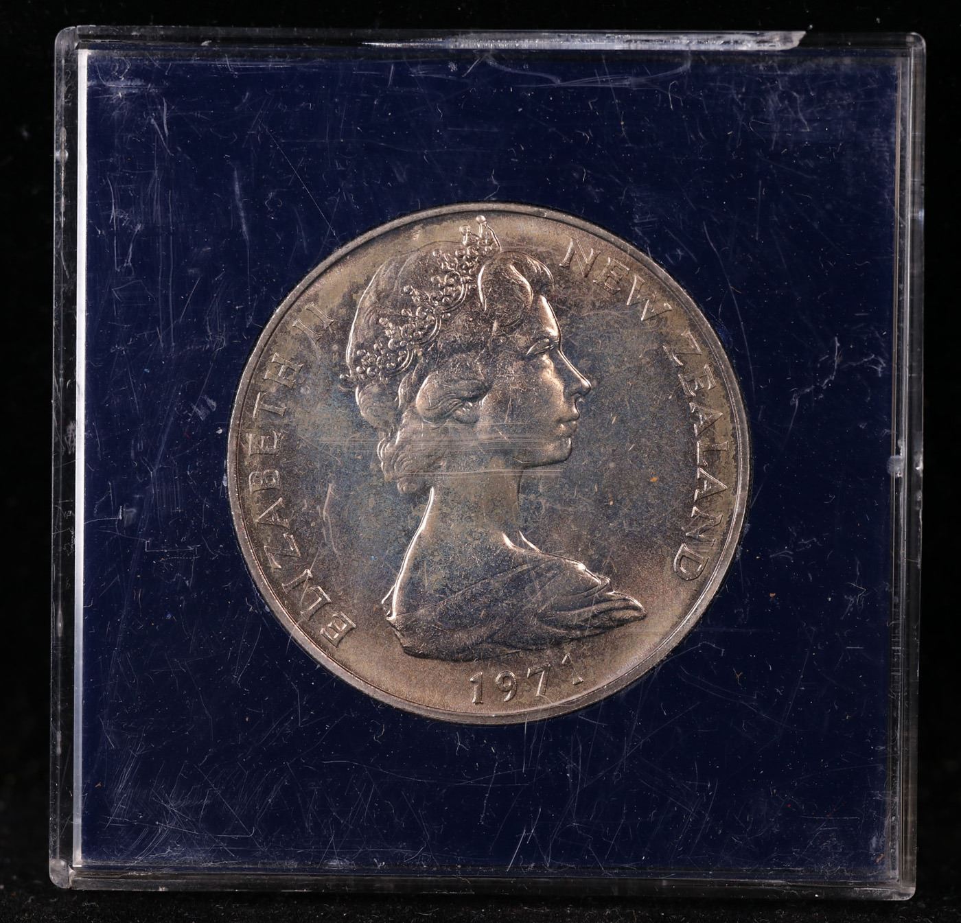 1971 New Zealand Decimal Currency Commemorative Dollar, second crowned portrait of Queen Elizabeth II.. This is a New Zealand Decimal Currency Commemorative Dollar and housed in a rigid plastic case. On July 10, 1967 the New Zealand currency changed from the pound to the dollar. This coin was produced in commemoration of this event. On the front is a crowned shield within silver fern leaves, on the back is Queen Elizabeth II.
