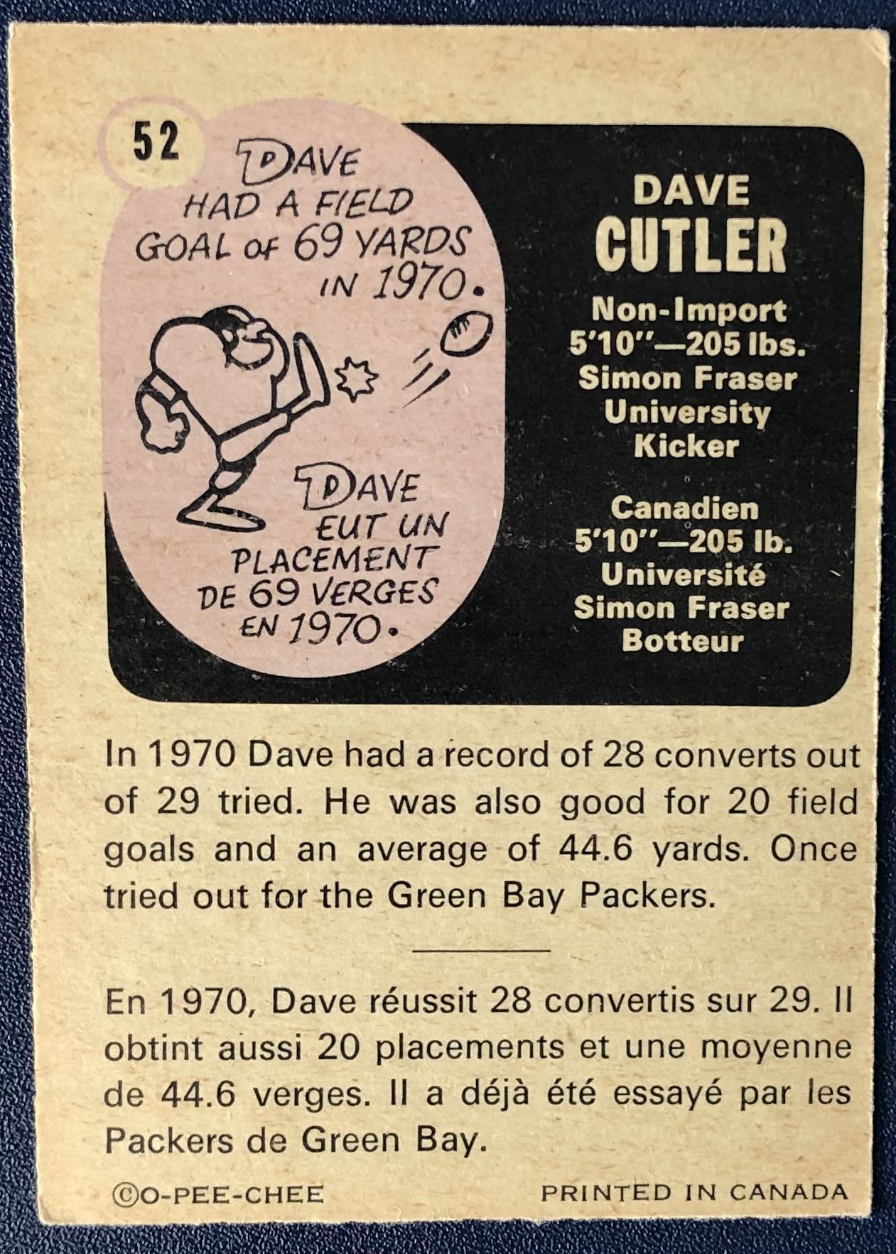 Card #52 CFL, OPC, hall of fame, rookie, vintage