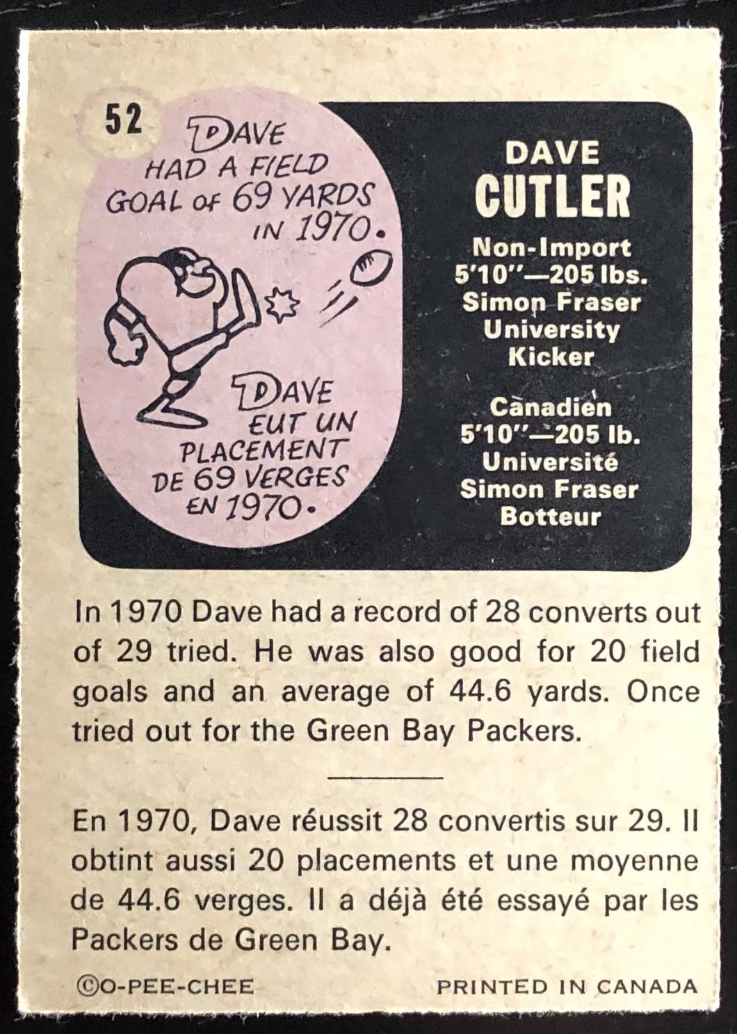 Card #52 CFL, football, vintage, hall of fame, OPC