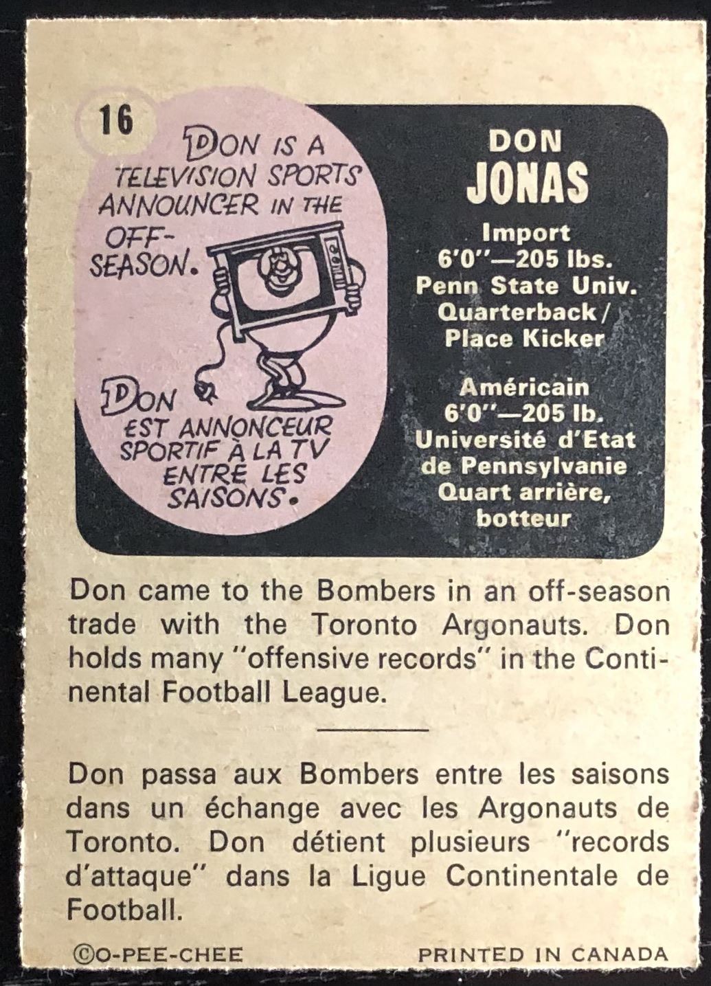 Card #16 CFL, football, vintage, hall of fame, OPC