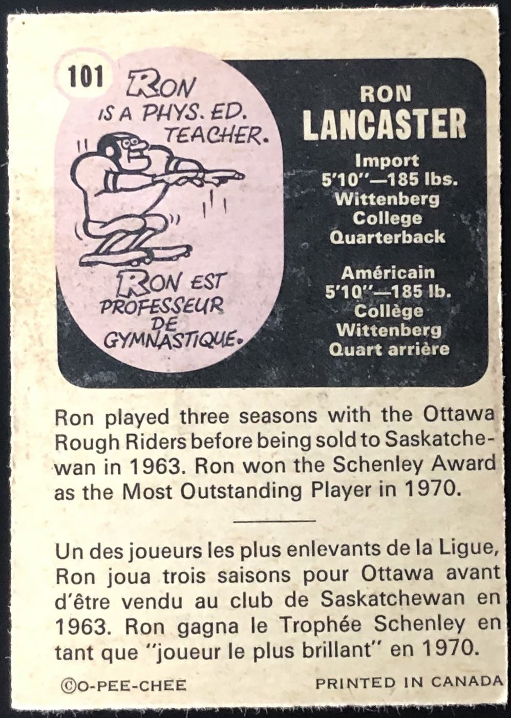 Card #101 CFL, football, vintage, hall of fame, OPC