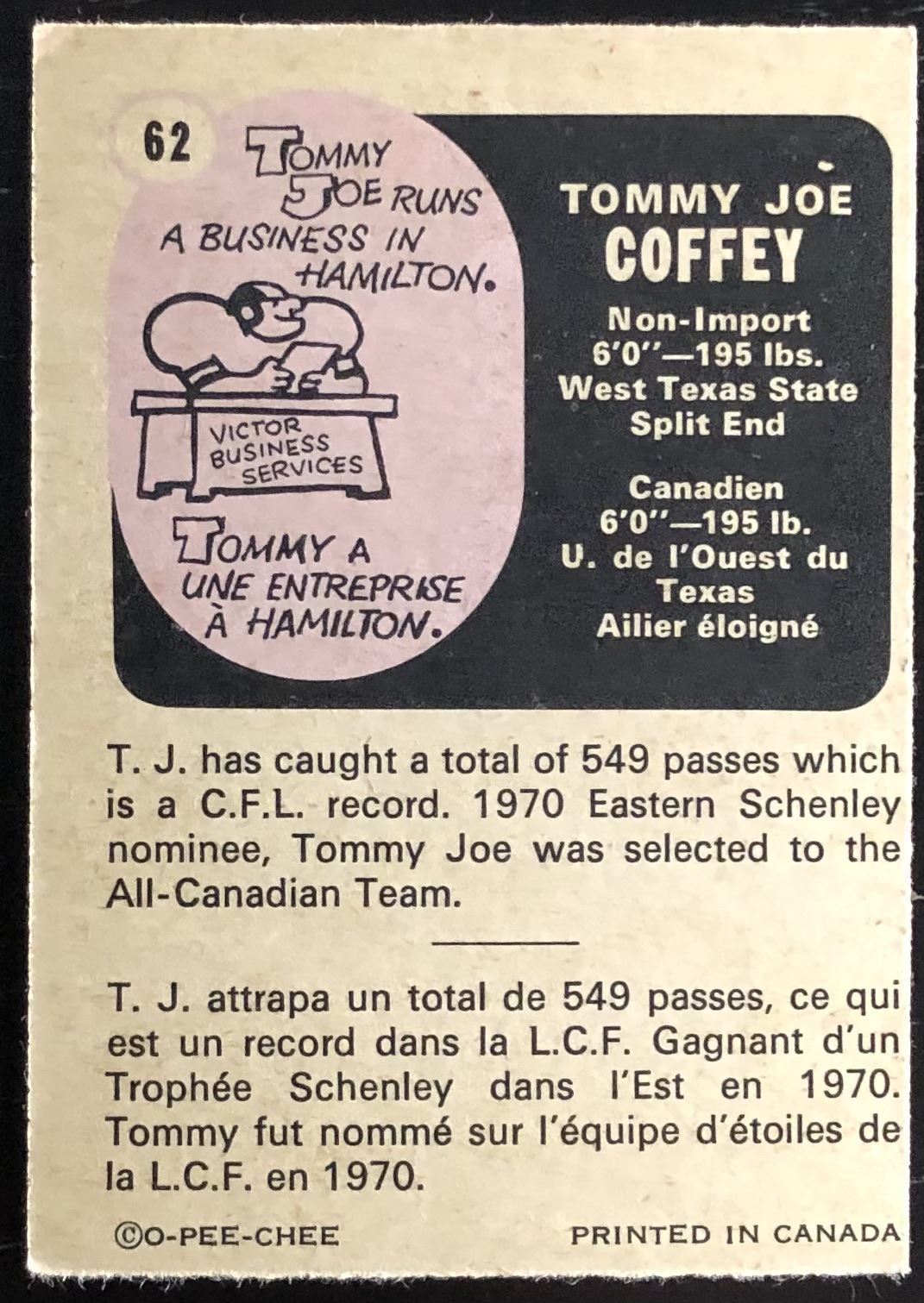 Card #62 CFL, football, vintage, hall of fame, OPC