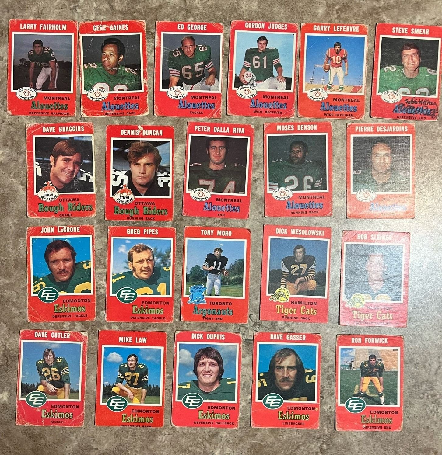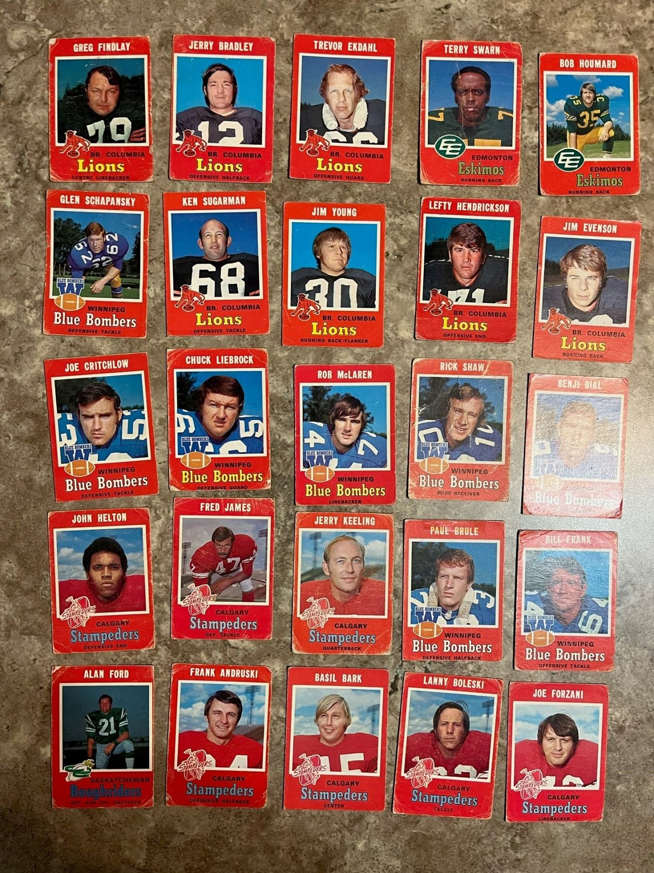 1971 O Pee Chee CFL football lot of 45 cards. No duplicates. Poor condition with soft corners and creases. See pictures before bidding.