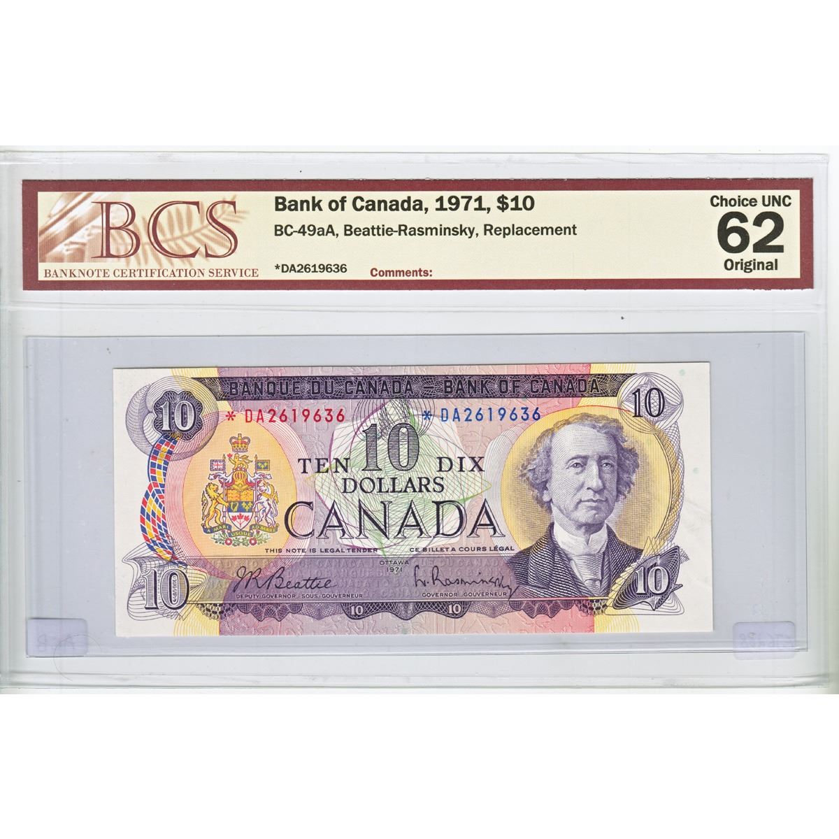 1971 Replacement $10.00 Note from the Bank of Canada; cat code BC-49aA, Beattie-Rasminsky signatures, Prefix *DA, BCS Certified CUNC-62, Original. Buyers Premium will be added on all items as per our terms of sale. We accept Paypal, Credit Card, E-Transfer Payments, Cheque or Money Orders (there is an additional 3% fee for using Paypal or Credit Card). All invoices will be emailed immediately following the auction, please contact us if you would like to pay by credit card or receive a new revised lower total for mailing in payment or sending an e-transfer (3% discount). All Items Are Sold "AS IS", no returns