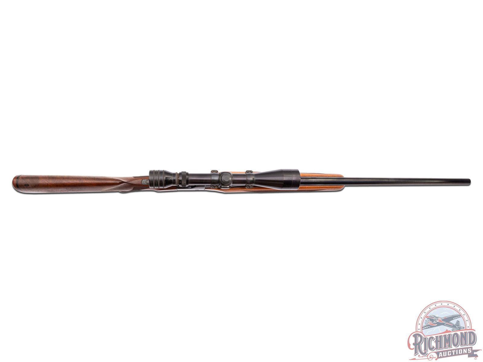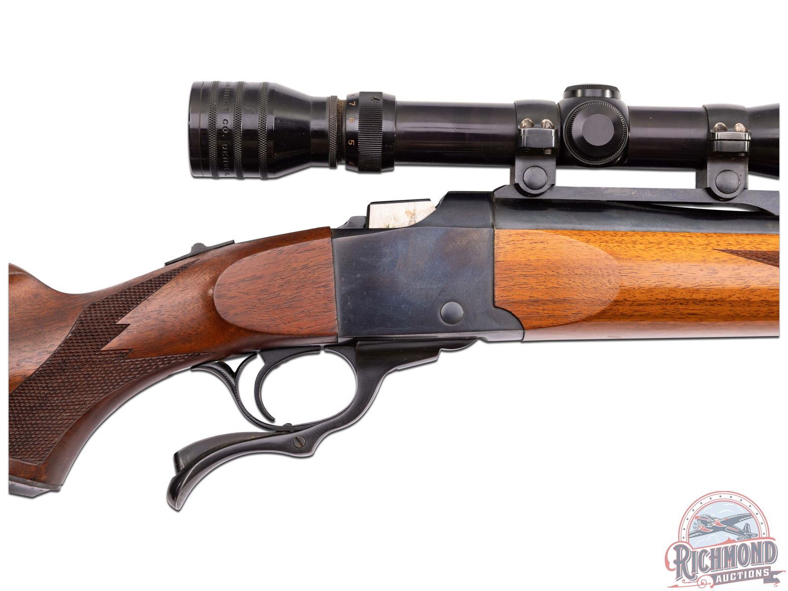 Manufactured in 1971, during the Douglas premium barrel timeframe. Features a 26" blued barrel with quarter rib scope mount and single line Ruger address. Chambered for the .270 Winchester cartridge. Equipped with a Redfield 3x9 scope. Blued receiver with a falling block breech action with artillery-style breechblock and under-lever. Tang mounted safety lever. Beautiful satin figured walnut stock with deep checkering on the pistol grip and semi- beavertail forearm. Fitted with sling bolts studs, factory black lined round red rubber recoil pad and factory metal pistol grip cap with gold tone Ruger medallion. LOP: 12-3/4". CALIBER: 270 WIN. S/N: 130-02634. FFL STATUS: Curio & Relic.