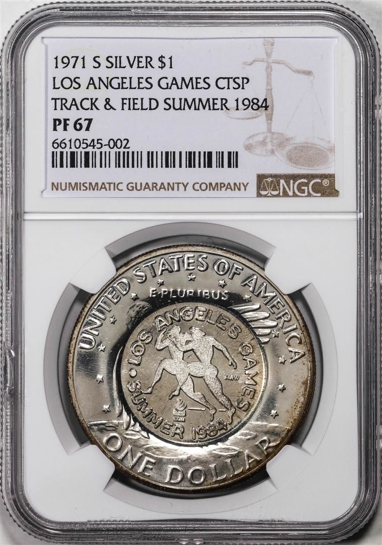 One 1971-S $1 LA Games Track & Field Olympic Commemorative Silver Dollar Coin NGC PF67. NGC Certified.