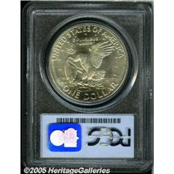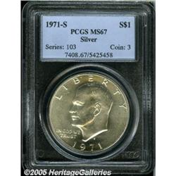 <B>1971-S<img border='0' src='http://www.heritagecoins.com/images/star.gif' width=10 height=10>$1 Silver MS67 PCGS.</B></I> This brilliant Ike dollar features smooth surfaces and well struck devices.