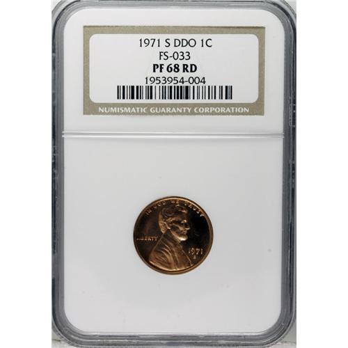 <B>1971-S 1C Doubled Die Obverse PR68 Red NGC.</B></I> FS-033. IN GOD WE TRUST and LIBERTY are die doubled with a noticeable spread. <I>Cherrypickers'</B></I> gives this variety a 'five star' interest designation, and it is also listed in the <I>Guide Book.</B></I> Brightly mirrored with bright orange-red surfaces that show a touch of haziness about the portrait.<BR><BR><b>Shipping:</b> Coin/Currency (<a target="_blank" href="http://www.heritageauctions.com/common/shipping.php">view shipping information</a>)