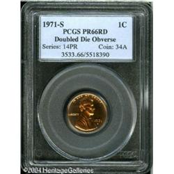 1971-S 1C Doubled Die PR66 Red PCGS. FS-032. Broad <B>1971-S 1C Doubled Die PR66 Red PCGS.</B></I> FS-032. Broad doubling is seen on LIBERTY on the obverse. A fully red, glittering proof specimen that is obviously rare as a die variety. Just a trace of cloudiness registers in the fields, certainly not enough to seriously effect the eye appeal, or influence the assigned grade of the piece. <BR><BR><B>Important notice:</B> Heritage usually auctions material at the rate of 200-250 lots per hour. On some occasions eBay Live bid software or the Internet may not be able to keep up with the pace of the auction. We recommend placing a realistic absentee bid now as insurance to avoid disappointment. Occasionally the auctioneer may eliminate or reject an eBay Live bid, and the auctioneer may also reopen a lot after the close of the eBay live bidding (usually because we missed an audience bid), and may reject your bid even if it shows you as the winning bidder. By bidding via eBay Live, you agree that Heritage may award the lot to another bidder at its sole discretion under the circumstances described above or any other reasonable circumstances. Since eBay bids are not shown to us until we open the lot on the floor, we treat those bids just like floor bids. In most cases the floor responds before the eBay bid is presented to us, due to Internet lag time, so for consistency we have made it a policy that floor bids are always considered first over tie eBay live bids. Also please note that all Heritage lots purchased through eBay Live carry a 20% Buyer's Premium. Please make sure you read the Terms and Conditions before you bid. This lot is being auctioned in conjunction with a live floor auction by Heritage Galleries & Auctioneers. All final auction and invoice information will be supplied by Heritage Galleries & Auctioneers, and all other information should be considered preliminary. Lot:5441