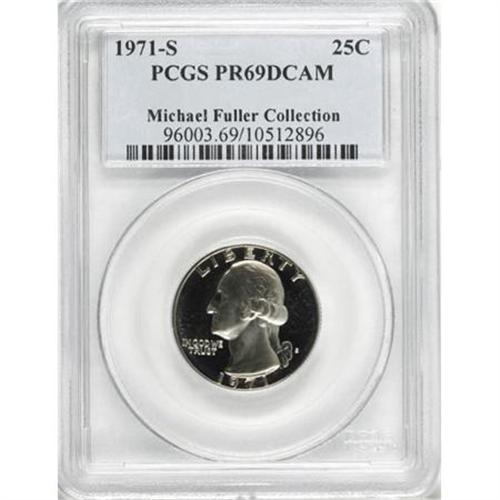 <B>1971-S 25C PR69 Deep Cameo PCGS.</B></I> Those Washington quarter specialists who are attempting collections for the PCGS registry program understand the importance of the present offering. Collectors who were active nearly four decades ago when the 1971-S proof sets were first issued recall the typical quality of coins and will be amazed when they view this beautiful piece.<BR> This example retains its full proof brilliance, with only a hint of champagne toning that adds to the overall aesthetic appeal. The contrast between the fields and devices is remarkable, and the quality of the strike is incredible. Every design element is boldly rendered to its maximum depth. Population: 9 in 69 Deep Cameo, 0 finer (10/07).<BR><I>From The Michael Fuller Collection.</B></I><BR><BR><b>Shipping:</b> Coins & Currency (<a target="_blank" href="http://www.heritageauctions.com/common/shipping.php">view shipping information</a>)