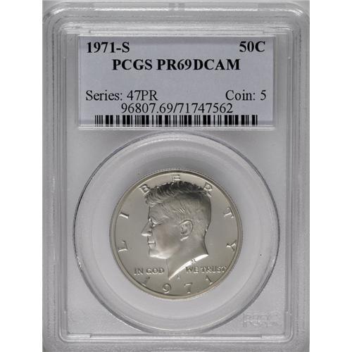<B>1971-S<50C> PR69 Deep Cameo PCGS.</B></I> Booming contrast between the fields and frosted lettering and devices. A glorious Kennedy half dollar that is tied with a select group as the finest seen by either NGC or PCGS of this date and showing the desired Deep Cameo contrast. Population: 59 in 69, 0 finer (3/06).<BR><I>From The J. S. Hamilton Registry Set of Proof Kennedy Half Dollars.</B></I> <BR><BR><B>Important notice:</B> Heritage usually auctions material at the rate of 200-250 lots per hour. On some occasions eBay Live bid software or the Internet may not be able to keep up with the pace of the auction. We recommend placing a realistic absentee bid now as insurance to avoid disappointment. Occasionally the auctioneer may eliminate or reject an eBay Live bid, and the auctioneer may also reopen a lot after the close of the eBay live bidding (usually because we missed an audience bid), and may reject your bid even if it shows you as the winning bidder. By bidding via eBay Live, you agree that Heritage may award the lot to another bidder at its sole discretion under the circumstances described above or any other reasonable circumstances. Since eBay bids are not shown to us until we open the lot on the floor, we treat those bids just like floor bids. In most cases the floor responds before the eBay bid is presented to us, due to Internet lag time, so for consistency we have made it a policy that floor bids are always considered first over tie eBay live bids. Also please note that all Heritage lots purchased through eBay Live carry a 20% Buyer's Premium. Please make sure you read the Terms and Conditions before you bid. This lot is being auctioned in conjunction with a live floor auction by Heritage Galleries & Auctioneers. All final auction and invoice information will be supplied by Heritage Galleries & Auctioneers, and all other information should be considered preliminary. Lot:3173 <BR><BR><B>Winning Notification and Billing:</B> After the FINAL session in this auction is complete, Heritage will send e-mail and snail mail invoices. This process normally takes several days. All final auction and invoice information will be supplied by Heritage Galleries & Auctioneers, and all other information should be considered preliminary. <BR><BR>This auction will be conducted on a live auction floor and over the Internet through eBay Live. If you choose to place an absentee bid, please take a moment to <font color='#0000ff'><u><a href='http://pages.ebay.com/liveauctions/help/before/laabsentee.html'>learn how eBay Live absentee bidding works</a></u></font><font color='#000000'>