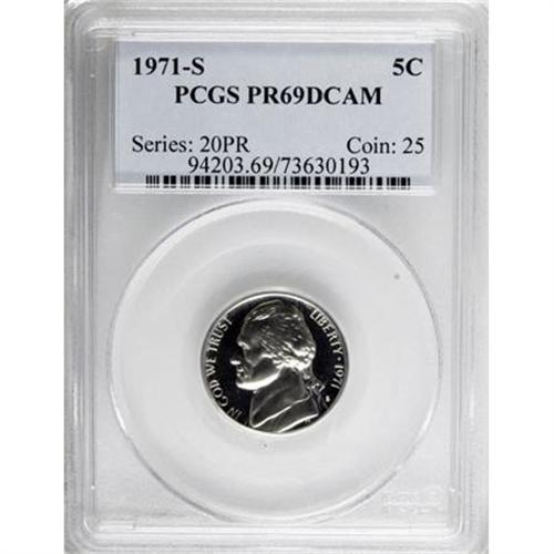 <B>1971-S 5C PR69 Deep Cameo PCGS.</B></I> PCGS Population (38/0). NGC Census: (17/0). Numismedia Wsl. Price for NGC/PCGS coin in PR69: $425. (#94203)<BR><BR><b>Shipping:</b> Coins & Currency (<a target="_blank" href="http://www.heritageauctions.com/common/shipping.php">view shipping information</a>\)