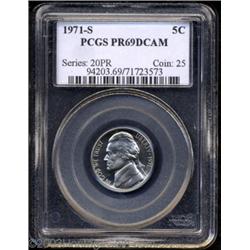 <TABLE cellSpacing=0 cellPadding=0 width="100%" bgColor=#000000 border=0><TBODY><TR><TD width="100%"><TABLE cellSpacing=1 cellPadding=3 width="100%" border=0><TBODY><TR><TD width="100%" bgColor=#79735c><FONT face=arial color=#ffffff size=3><B>Description</B> </FONT></TD></TR><TR><TD width="100%" bgColor=#ffffff><FONT face=arial size=2><B>1971-S 5C PR69 Deep Cameo PCGS.</B></I> Bright and fully original with a blazing white appearance. Population: 3 in 69, 0 finer (8/03). </FONT></TD></TR></TBODY></TABLE></TD></TR></TBODY></TABLE><BR><A name=PricesRealized></A><TABLE cellSpacing=0 cellPadding=0 width="100%" bgColor=#000000 border=0><TBODY><TR><TD width="100%"><TABLE cellSpacing=1 cellPadding=3 width="100%" border=0><TBODY><TR><TD width="100%" bgColor=#79735c><A name=PR><FONT face=arial color=#ffffff size=3><B>Previous Prices from Heritage Auctions</B> </FONT></A></TD></TR><TR><TD bgColor=#f6f6ed><TABLE cellSpacing=0 cellPadding=0 width="100%" border=1><TBODY><TR><TD align=middle width="33%"><B>Date</B></TD><TD align=middle width="33%"><B>Service</B></TD><TD align=middle width="33%"><B>Price</B></TD></TR><TR bgColor=whitesmoke><TD width="33%"><B>06/17/2003</B></TD><TD width="33%">PCGS</TD><TD width="33%">$747.50</TD></TR></TBODY></TABLE></TD></TR><TR><TD bgColor=#ffffff><FONT face=arial size=1 ?>PLEASE NOTE: All prices realized reflect the final hammer price PLUS the buyer's premium in auctions that charge a buyer's premium. Each item has a notation at the top of the listing indicating whether that lot included a buyer's premium. Example: A item that sells with a final hammer price of $100 and a 20% buyer's premium will display with a price realized of $120. All information listed is intended to be as accurate as possible, but errors are possible. Please use this guide carefully and inform us of any inaccuracies. </FONT></TD></TR></TBODY></TABLE></TD></TR></TBODY></TABLE><BR><TABLE cellSpacing=0 cellPadding=0 width="100%" bgColor=#000000 border=0><TBODY><TR><TD width="100%"><TABLE cellSpacing=1 cellPadding=3 width="100%" border=0><TBODY><TR><TD width="100%" bgColor=#79735c colSpan=6><FONT face=arial color=#ffffff size=3><B>Price Guide*</B> </FONT></TD></TR><TR bgColor=#f6f6ed><TD align=middle><B>Grade</B> </TD><TD align=middle><B>Coin World<BR>(Trends)</B> </TD><TD align=middle><B>Numismedia<BR>Retail</B> </TD><TD align=middle><B>Numismedia<BR>Wholesale</B> </TD><TD align=middle><B>Coin<BR>Universe</B> </TD><TD align=middle><B>Heritage<BR>Value Index</B> </TD></TR><TR bgColor=#ffffff><TD align=middle>68</TD><TD align=right>---</TD><TD align=right>---</TD><TD align=right>---</TD><TD align=right>$79.00</TD><TD align=right>($1.00)</TD></TR><TR style="FONT-WEIGHT: bold" bgColor=#cccfdd><TD align=middle>69</TD><TD align=right>---</TD><TD align=right>---</TD><TD align=right>---</TD><TD align=right>$3,500.00</TD><TD align=right>($1.00)</TD></TR><TR bgColor=#ffffff><TD align=middle>70</TD><TD align=right>---</TD><TD align=right>---</TD><TD align=right>---</TD><TD align=right>---</TD><TD align=right>($1.00)</TD></TR><TR bgColor=#ffffff><TD colSpan=6><FONT size=1>*All information listed is intended to be as accurate as possible, but errors are possible. No item may be returned or refused based on this information which is provided as a service to our customers. You should contact each pricing source directly to determine the accuracy of this information. </FONT></TD></TR></TBODY></TABLE></TD></TR></TBODY></TABLE><BR><TABLE cellSpacing=0 cellPadding=0 width="100%" bgColor=#000000 border=0><TBODY><TR><TD width="100%"><TABLE cellSpacing=1 cellPadding=3 width="100%" border=0><TBODY><TR><TD width="100%" bgColor=#79735c><FONT face=arial color=#ffffff size=3><B>Population Guide</B> </FONT></TD></TR><TR bgColor=#ffffff><TD align=middle><!-- Begin Output of Population Grid--><TABLE cellSpacing=0 cellPadding=0 width="100%" border=0><TBODY><TR><TD vAlign=center><TABLE cellSpacing=0 width="100%" border=1 cellsadding="3"><TBODY><TR><TD vAlign=center><TABLE cellSpacing=0 cellPadding=3 width="100%" border=1><TBODY><TR><TD vAlign=center align=middle bgColor=#f0f1e8 colSpan=2 <CENTER><FONT face=Arial size=2><B>PCGS Pop </B></FONT><CENTER></CENTER></TD><TD vAlign=center align=middle bgColor=#f0f1e8 colSpan=2><CENTER><FONT face=Arial size=2><B>NGC Pop</B></CENTER></FONT></TD></TR><TR><TD vAlign=center><FONT face=Arial size=2>(69)</FONT> </TD><TD vAlign=center align=right><FONT face=Arial size=2>3</FONT> </TD><TD vAlign=center><FONT face=Arial size=2>(69)</FONT> </TD><TD vAlign=center align=right><FONT face=Arial size=2>7</FONT> </TD></TR><TR><TD vAlign=center><FONT face=Arial size=2>(>69)</FONT> </TD><TD vAlign=center align=right><FONT face=Arial size=2>0</FONT> </TD><TD vAlign=center><FONT face=Arial size=2>(>69)</FONT> </TD><TD vAlign=center align=right><FONT face=Arial size=2>0</FONT> </TD></TR></TBODY></TABLE></TD></TR></TBODY></TABLE></TD></TR></TBODY></TABLE><!-- End Output of Population Grid--> Important notice: Heritage usually auctions material at the rate of 200-250 lots per hour. On some occasions eBay Live bid software or the Internet may not be able to keep up with the pace of the auction. We recommend placing a realistic absentee bid now as insurance to avoid disappointment. Occasionally the auctioneer may eliminate or reject an eBay Live bid, and the auctioneer may also reopen a lot after the close of the eBay live bidding (usually because we missed an audience bid), and may reject your bid even if it shows you as the winning bidder. By bidding via eBay Live, you agree that Heritage may award the lot to another bidder at its sole discretion under the circumstances described above or any other reasonable circumstances. Also please note that all Heritage lots purchased through eBay Live carry a 20% Buyer's Premium. Please make sure you read the Terms and Conditions before you bid.</TD></TR></TBODY></TABLE></TD></TR></TBODY></TABLE>