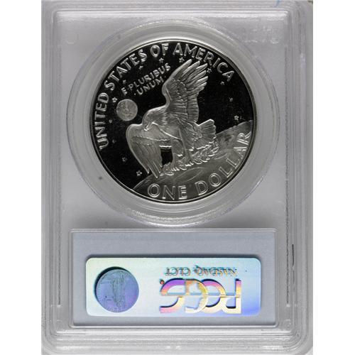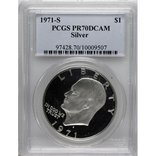 <B>1971-S S$1 Silver PR70 Deep Cameo PCGS.</B></I> Though the 40% silver-clad composition begun in 1965 for Kennedy halves was discontinued for circulation in 1970, the modern billon variant segued to the collector arena. Special non-circulating Eisenhower dollars in distinctive packaging were popular Mint products from 1971 until the concluding Bicentennial issues of 1976. The uncirculated-finish pieces were shipped in blue envelopes, while the proof examples appeared in distinctive brown boxes with a woodgrain pattern.<BR> Far from the average brown-box Eisenhower dollar, this technically perfect certified Ike has exceptional reflectivity and richly frosted, decisively struck devices. An extreme condition rarity in this condition, one of just two specimens assigned the ultimate grade by PCGS (4/07).<BR><BR><b>Shipping:</b> Coins & Currency (<a target="_blank" href="http://www.heritageauctions.com/common/shipping.php">view shipping information</a>)
