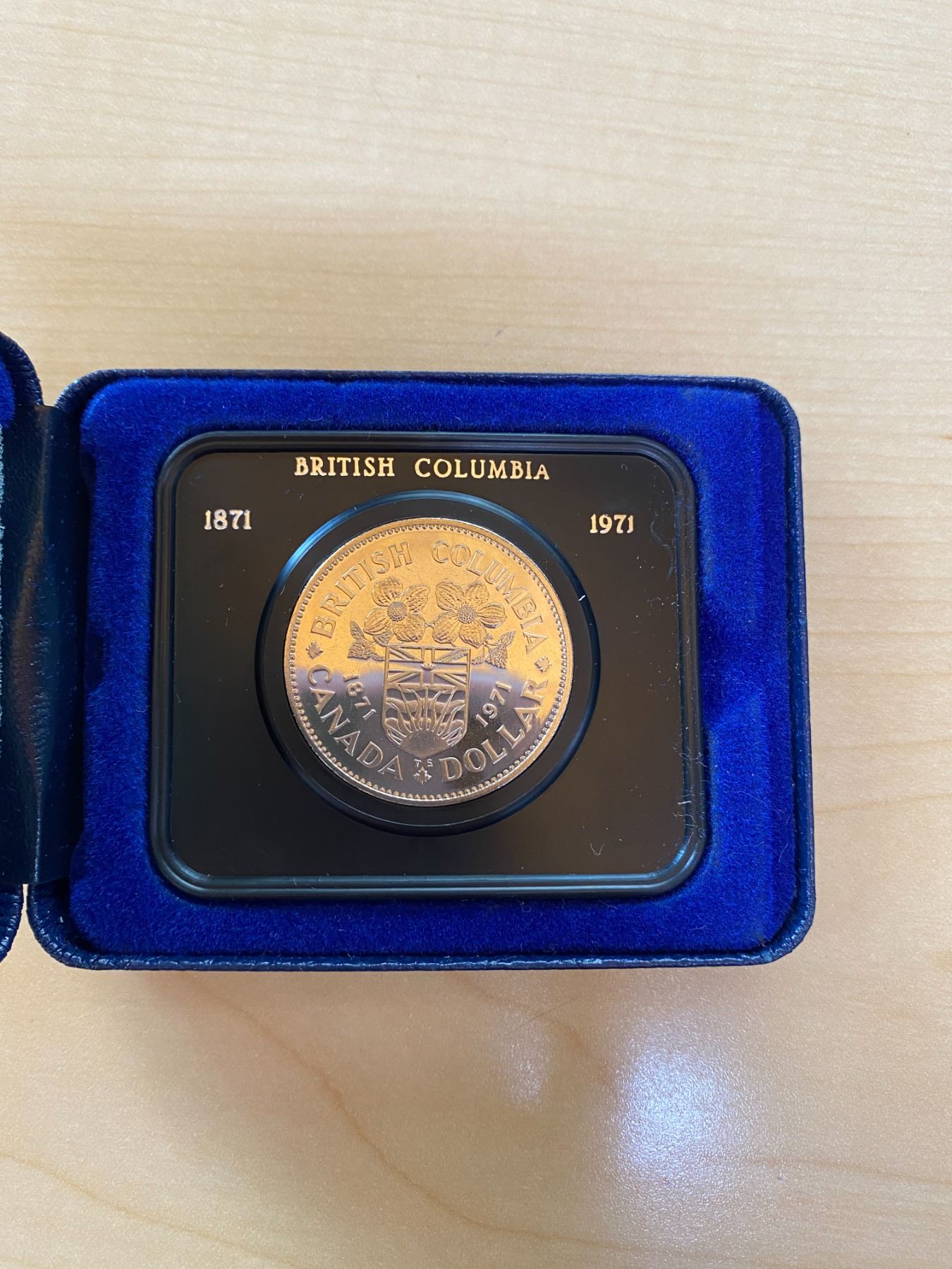 1971 Specimen Dollar that commemorates the 100th Anniversary of British Columbia joining Confederation in 1871. Housed in its original blue leatherette case. Specimen.