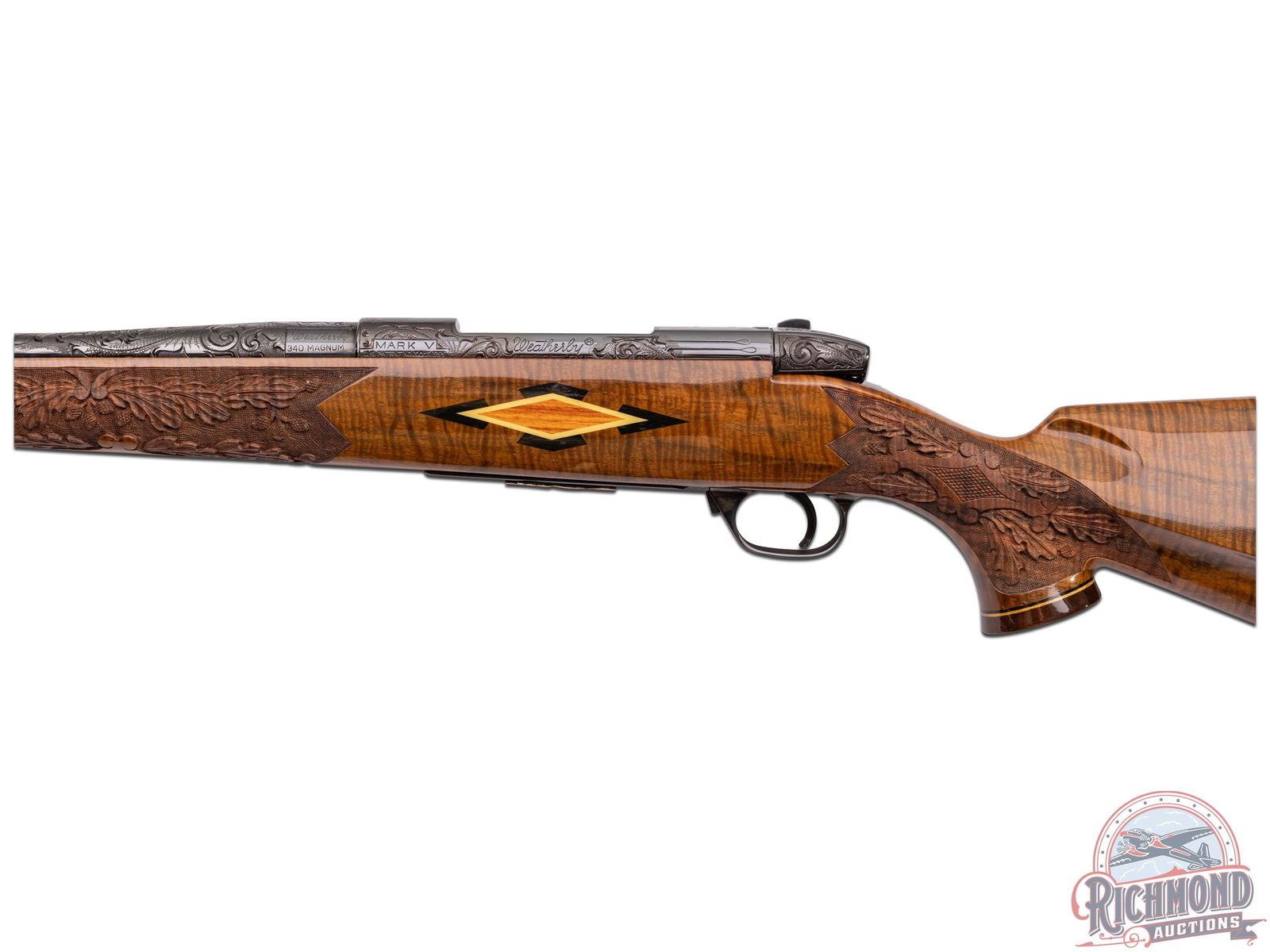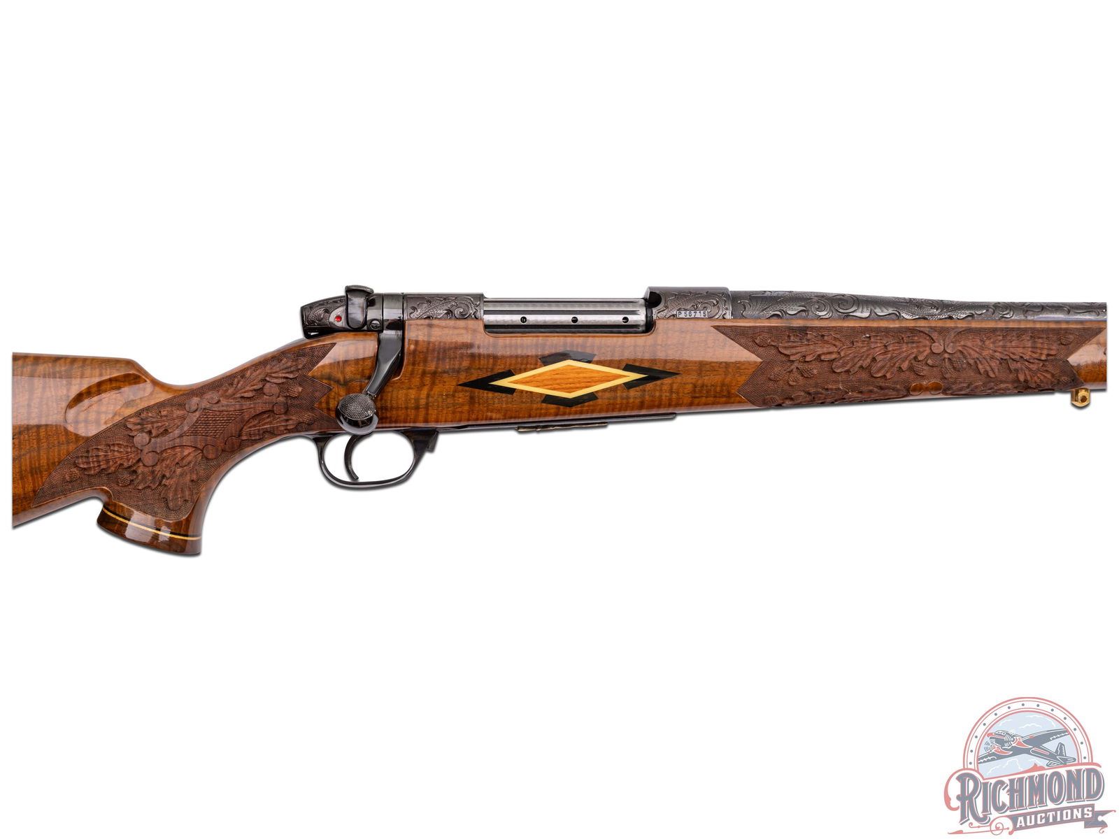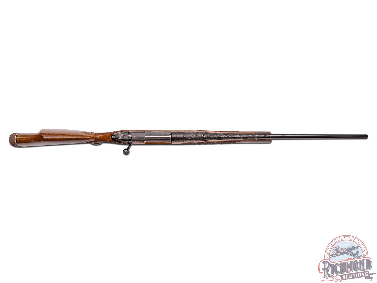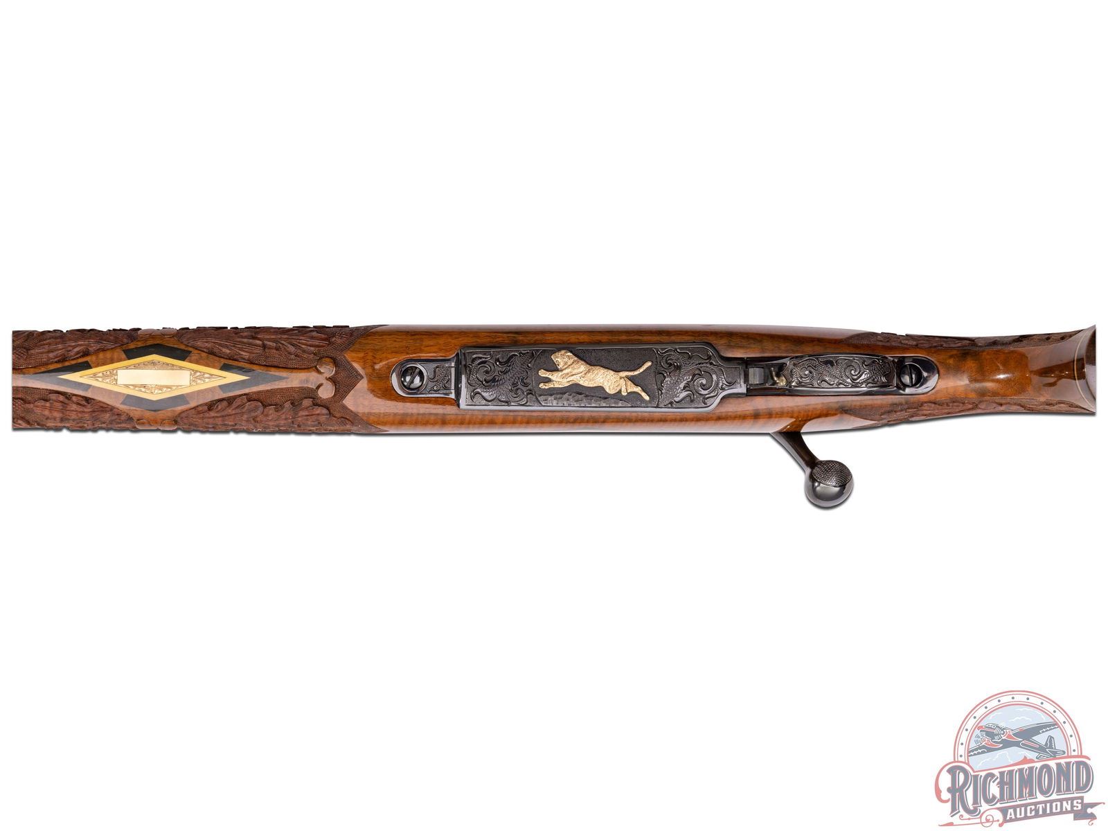 Custom made in West Germany in 1971 and South Gate custom shop engraved. Features a 26" blued sightless tapered barrel. Barrel has 40% coverage featuring floral scroll engraving that extends 11" from receiver. Receiver has matching engraving with 80% coverage. Top of the receiver is drilled for scope mounts. Blued floorplate has 85% coverage with a gold embossed leaping tiger. Two position safety with jeweled bolt and follower and knurled bolt knob. Engraved trigger guard with serrated trigger. Heavy grain factory Weatherby walnut Monte Carlo style stock with contrasting dark walnut forearm tip and pistol grip cap. Pistol grip features a gold engraved diamond shaped inlay. Deep relief factory carved stock featuring the Weatherby oak leaf and acorn pattern with scroll to diamond centers on the grip. Bottom of foregrip and both sides of the receiver feature a diamond tri-wood inlay consisting of bony, birch and rosewood. Bottom of the forearm inlay features a gold engraved inlaid plate. Right side of the stock has a larger, matching tri-wood inlay. Factory gold plate sling studs. Fitted with a Weatherby brown ventilated recoil pad. Includes Weatherby factory paperwork stating upgrades done in 1988 totaling over $3,300. LOP: 13-1/2". CALIBER: 340 WBY MAG. S/N: P56715. FFL STATUS: Curio & Relic.