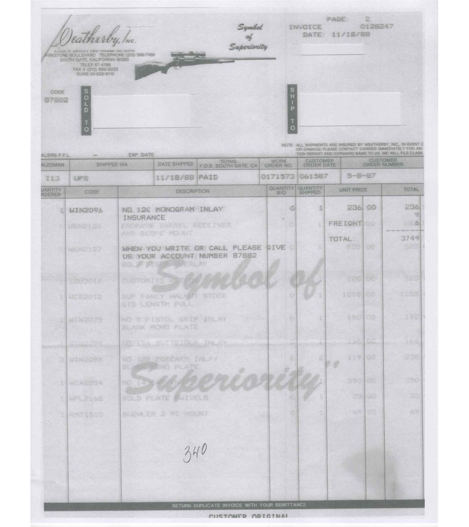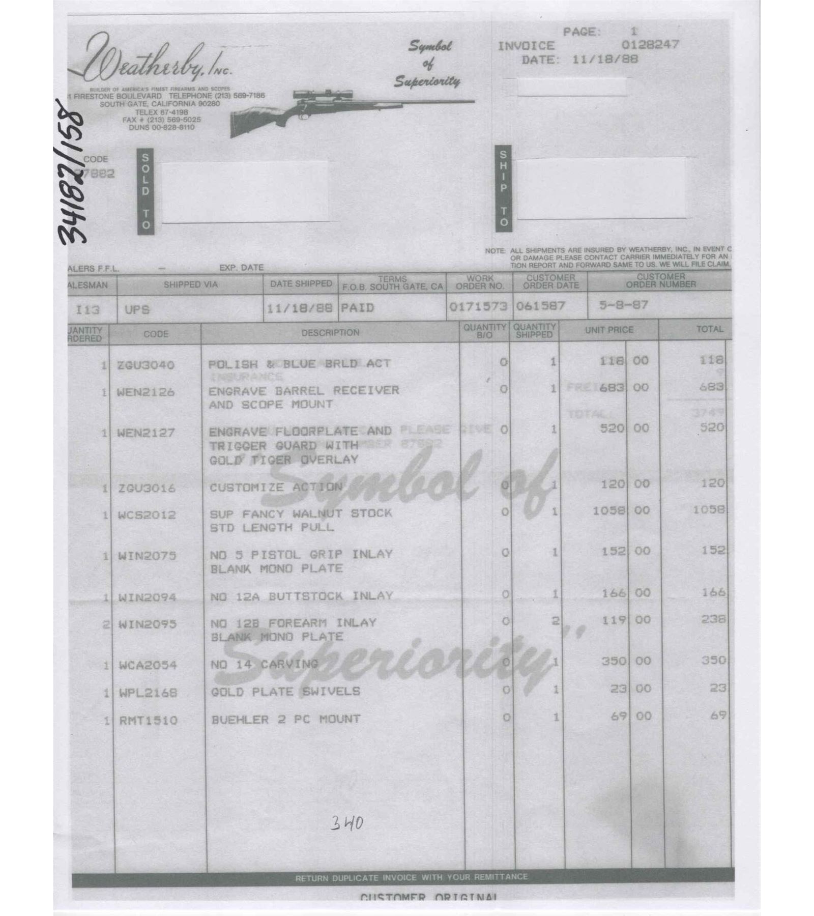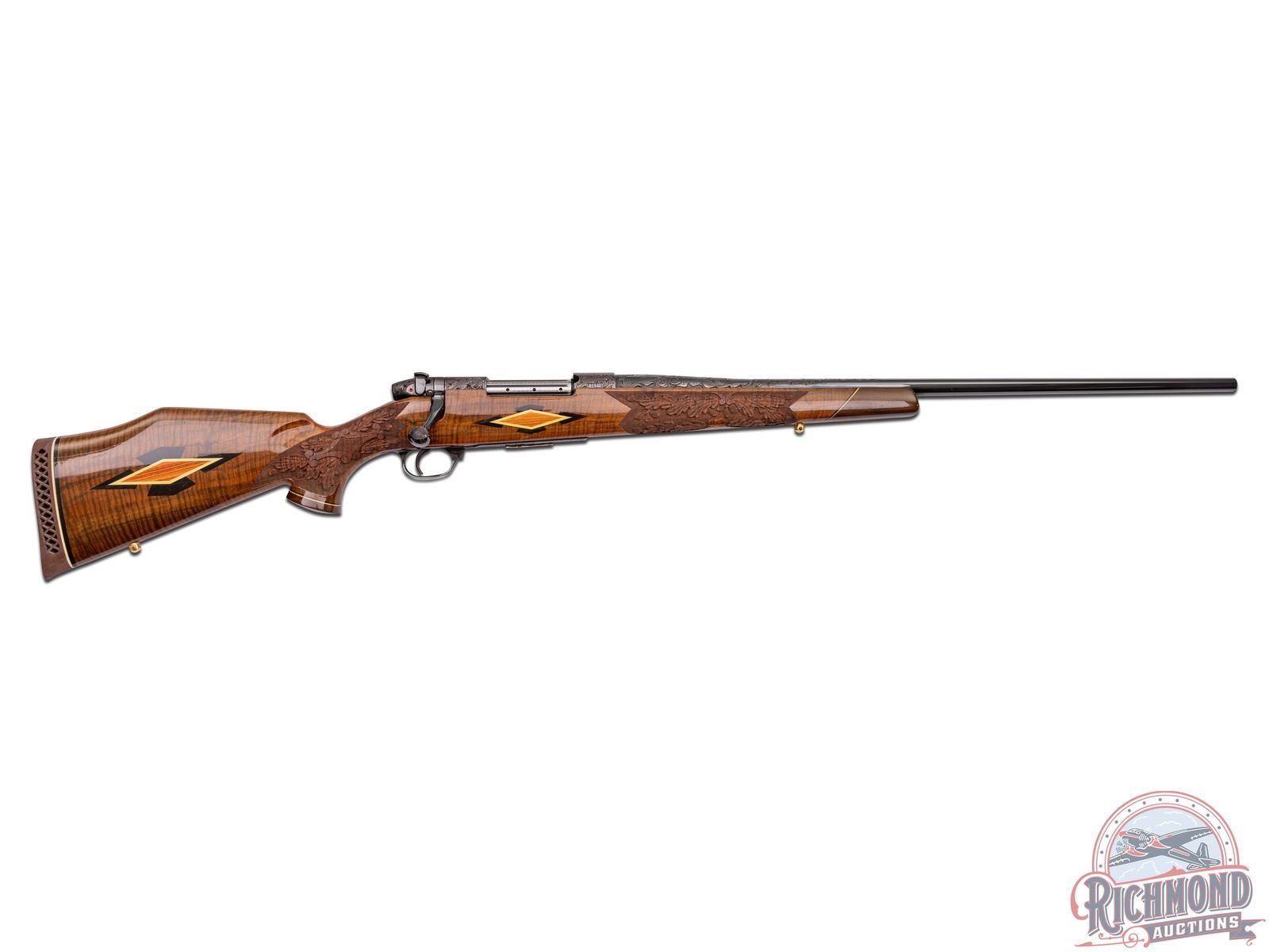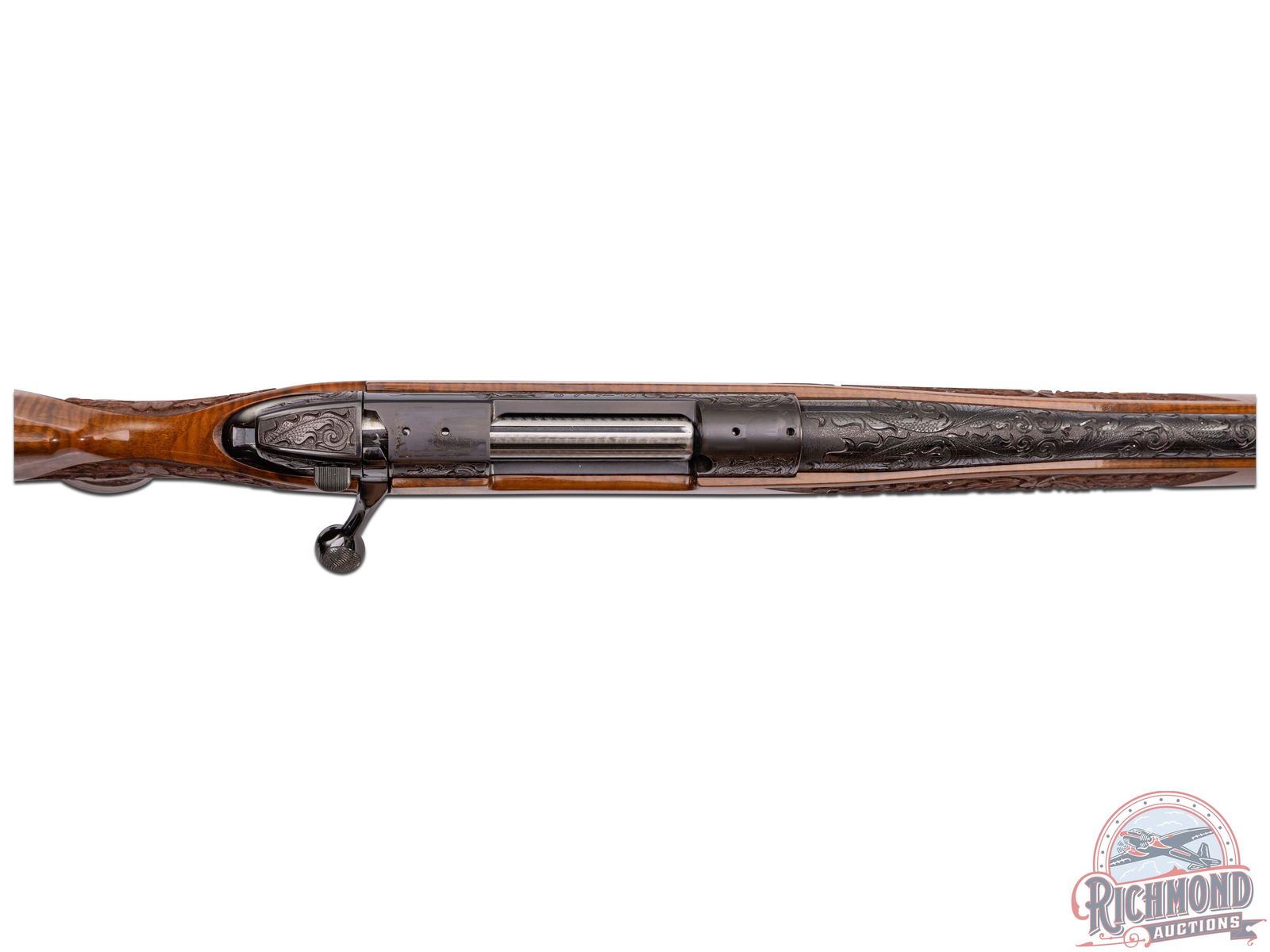 Custom made in West Germany in 1971 and South Gate custom shop engraved. Features a 26" blued sightless tapered barrel. Barrel has 40% coverage featuring floral scroll engraving that extends 11" from receiver. Receiver has matching engraving with 80% coverage. Top of the receiver is drilled for scope mounts. Blued floorplate has 85% coverage with a gold embossed leaping tiger. Two position safety with jeweled bolt and follower and knurled bolt knob. Engraved trigger guard with serrated trigger. Heavy grain factory Weatherby walnut Monte Carlo style stock with contrasting dark walnut forearm tip and pistol grip cap. Pistol grip features a gold engraved diamond shaped inlay. Deep relief factory carved stock featuring the Weatherby oak leaf and acorn pattern with scroll to diamond centers on the grip. Bottom of foregrip and both sides of the receiver feature a diamond tri-wood inlay consisting of bony, birch and rosewood. Bottom of the forearm inlay features a gold engraved inlaid plate. Right side of the stock has a larger, matching tri-wood inlay. Factory gold plate sling studs. Fitted with a Weatherby brown ventilated recoil pad. Includes Weatherby factory paperwork stating upgrades done in 1988 totaling over $3,300. LOP: 13-1/2". CALIBER: 340 WBY MAG. S/N: P56715. FFL STATUS: Curio & Relic.