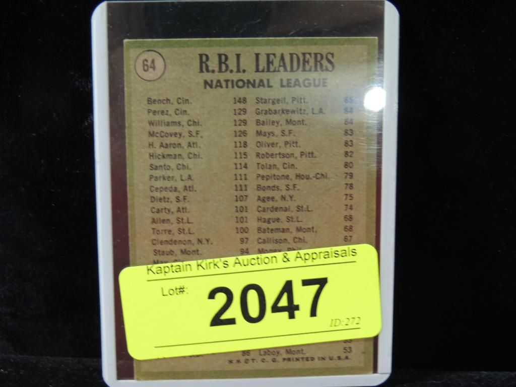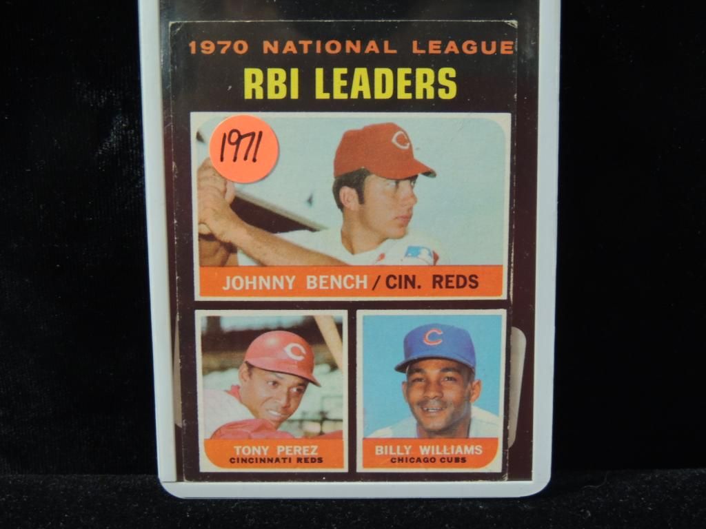1970 NATIONAL LEADERS RBI LEADERS JOHNNY BENCH, TONY PEREZ, BILLY WILLIAMS. GOOD CONDITION. IN PROTECTIVE PLASTIC SLEEVE. BASEBALL PLAYER CARDS. BASEBALL TRADING CARDS. VINTAGE CARDS. AS SHOWN. SEE PHOTO FOR MORE DETAILS.