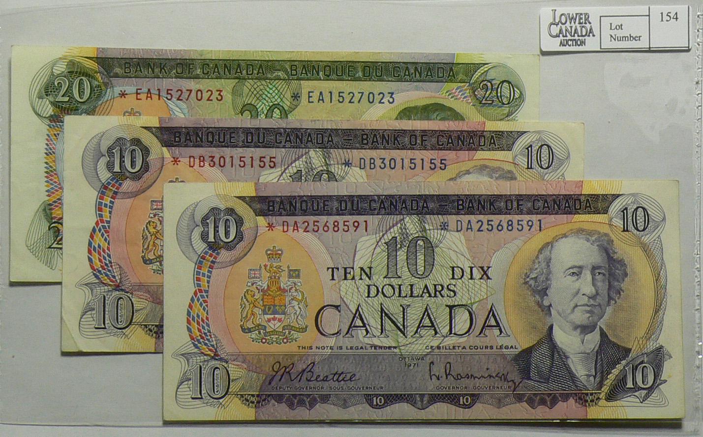 1971 $10, Repl. Lot, BC-49aA serial *DA2568591, BC-49aA serial *DB3015155 & $20 Repl. BC-50aA serial *EA1527023.
