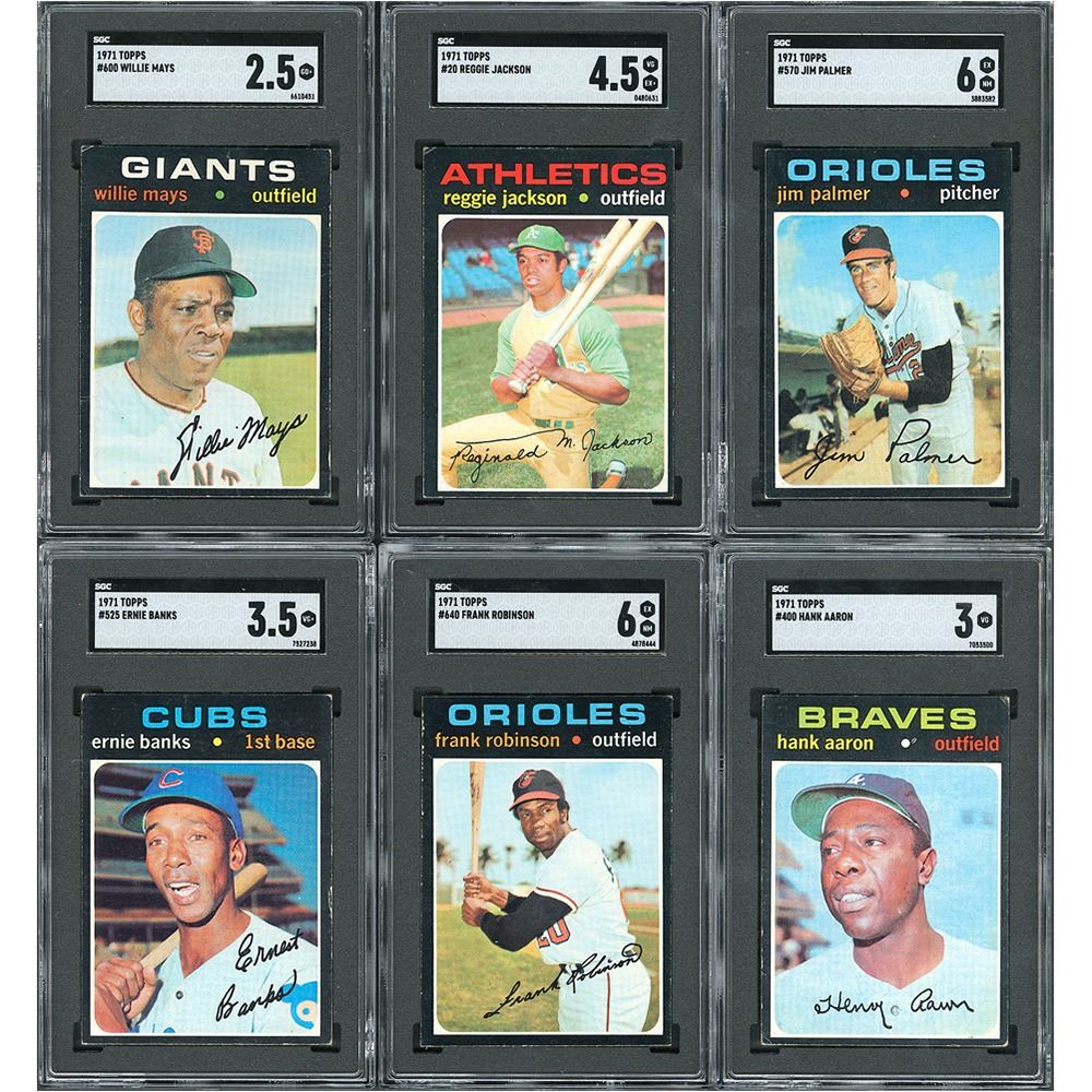 Complete set of these black bordered beauties, with six cards graded by SGC. Includes: Graded Cards - 6 cards with #20 Jackson (SGC VG/EX 4), 400 Aaron (SGC VG 3), 525 Banks (SGC VG+ 3.5), 570 Palmer (SGC EX/NM 6), 600 Mays (SGC GD+ 2.5), and 640 F. Robinson (SGC EX/NM 6). Ungraded Cards - #5 Munson (EX/MT), 26 Blyleven RC (NM), 55 Carlton (EX/MT), 100 Rose (EX), 160 Seaver (EX), 180 Kaline (EX), 210 Carew (VG/EX), 250 Bench (VG/EX), 300 B. Robinson (EX/MT+), 341 Garvey RC (VG), 513 Ryan (VG/EX), 530 Yastrzemski (VG), 550 Killebrew (EX), 625 Brock (EX), 630 Clemente (NM), 650 Allen SP (VG/EX), 688 Anderson SP (VG), 700 Powell SP (EX) and 709 Baylor/Baker RC (NM). Grades 50% EX to EX/MT or better, 50% VG to VG/EX, some lesser.