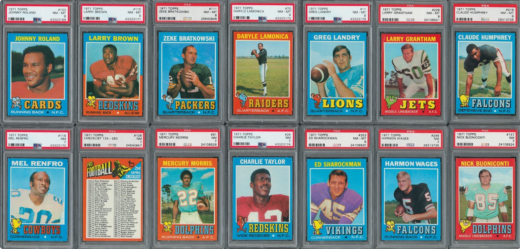 Includes: PSA Graded Cards - NM-MT 8: 15 cards with #8 Garrison, 11, 50 Jurgensen, 61 Stenerud, 67 Anderson, 70 Lamonica, 71 Page, 111, 115 Larry Brown, 120 Tarkenton, 123, 125 Olsen, 218 Humphrey, 228, and 253.