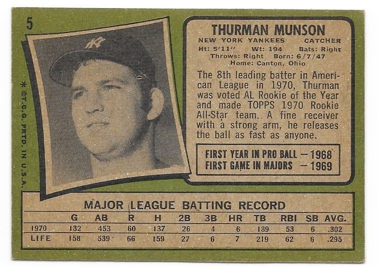 1971 Topps Thurman Munson Card #5 Yankees Legend