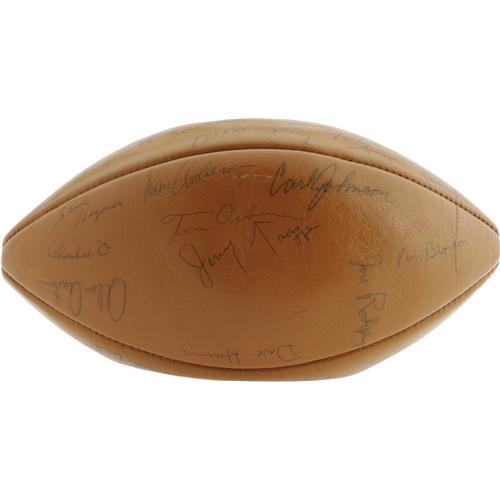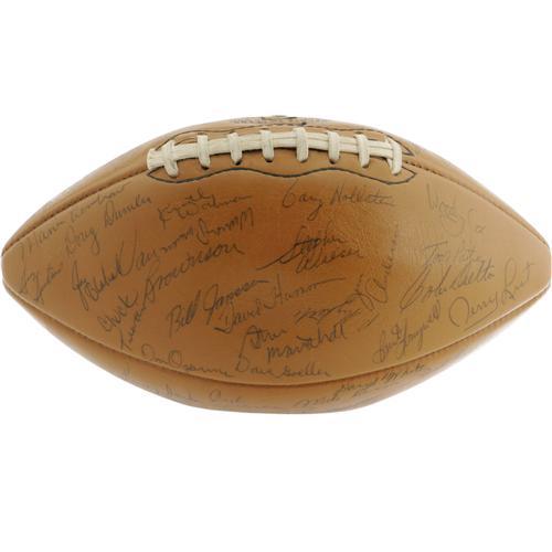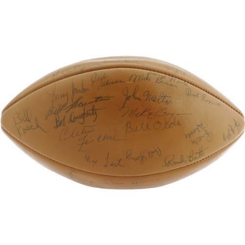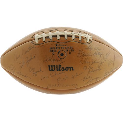 <B>1971 University of Nebraska Team Signed Football.</B></I> Named by the sports television network ESPN (and countless thousands of football fans) the Greatest College Team of All-Time, the Huskers of 1971 are flawlessly represented here on this Wilson football holding over sixty-five magnificent (8/10 or better) autographs from the storied squad. The team that fought to a 35-31 win over Oklahoma on Thanksgiving day in one of the most famous games in NCAA history ended the season with an Orange Bowl victory after posting a 13-0 record, cementing a legacy that remains as strong as ever over three decades later. All of the essentials are here: the unstoppable kick returner and wide receiver Johnny Rodgers, Coach Bob Devany, the dependable quarterback Jerry Tagge, and nose tackle Rich Glover, with future Cornhucker coach and Nebraska Congressman Tom Osborne. Without a doubt, this is the most complete and high-grade specimen to derive from this historic team. <I>LOA from PSA/DNA.</B></I> <BR><BR><B>Important notice:</B> Heritage usually auctions material at the rate of 200-250 lots per hour. On some occasions eBay Live bid software or the Internet may not be able to keep up with the pace of the auction. We recommend placing a realistic absentee bid now as insurance to avoid disappointment. Occasionally the auctioneer may eliminate or reject an eBay Live bid, and the auctioneer may also reopen a lot after the close of the eBay live bidding (usually because we missed an audience bid), and may reject your bid even if it shows you as the winning bidder. By bidding via eBay Live, you agree that Heritage may award the lot to another bidder at its sole discretion under the circumstances described above or any other reasonable circumstances. Since eBay bids are not shown to us until we open the lot on the floor, we treat those bids just like floor bids. In most cases the floor responds before the eBay bid is presented to us, due to Internet lag time, so for consistency we have made it a policy that floor bids are always considered first over tie eBay live bids. Also please note that all Heritage lots purchased through eBay Live carry a 22.5% Buyer's Premium. Please make sure you read the Terms and Conditions before you bid. This lot is being auctioned in conjunction with a live floor auction by Heritage Galleries & Auctioneers. All final auction and invoice information will be supplied by Heritage Galleries & Auctioneers, and all other information should be considered preliminary. Lot:19311 <BR><BR><B>Winning Notification and Billing:</B> After the FINAL session in this auction is complete, Heritage will send e-mail and snail mail invoices. This process normally takes several days. All final auction and invoice information will be supplied by Heritage Galleries & Auctioneers, and all other information should be considered preliminary. <BR><BR>This auction will be conducted on a live auction floor and over the Internet through eBay Live. If you choose to place an absentee bid, please take a moment to <font color='#0000ff'><u><a href='http://pages.ebay.com/liveauctions/help/before/laabsentee.html'>learn how eBay Live absentee bidding works</a></u></font><font color='#000000'>