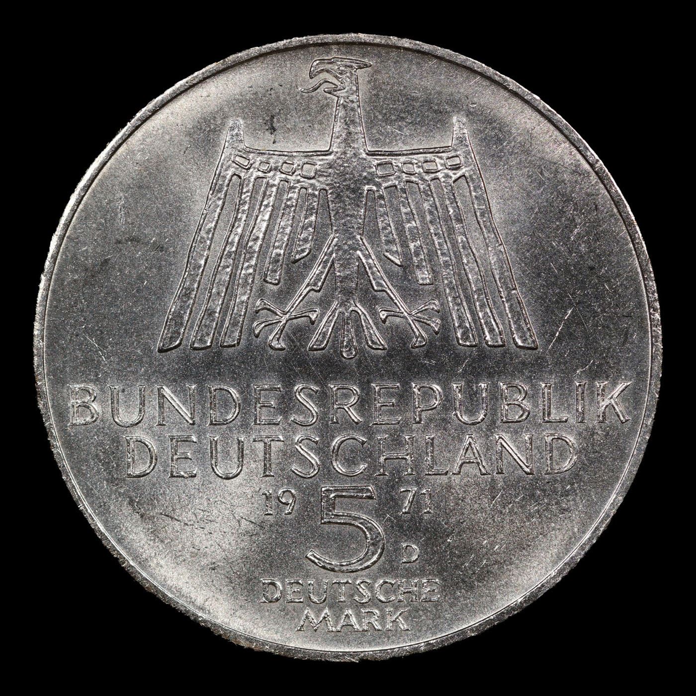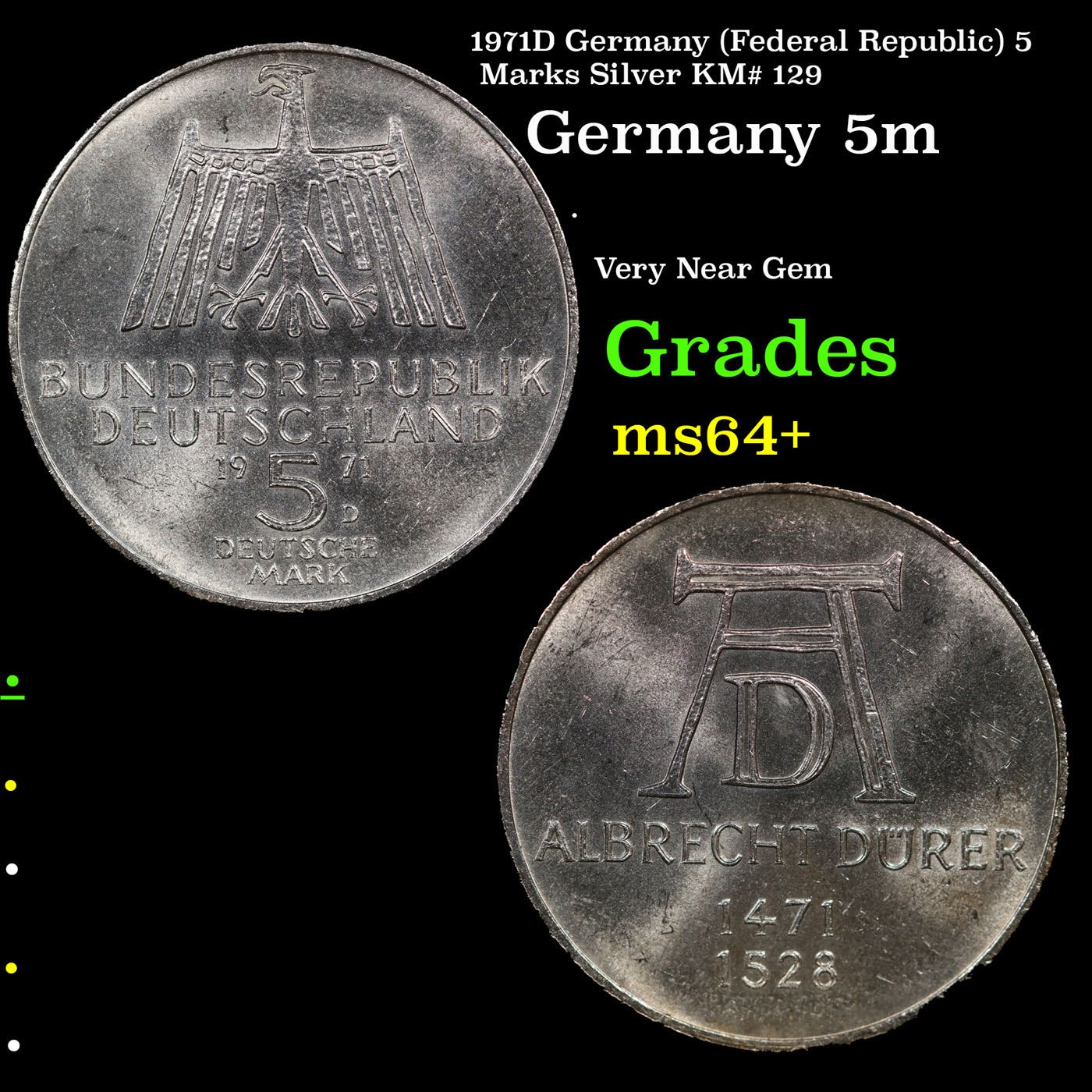 1971D Germany (Federal Republic) 5 Marks Silver KM# 129 Grades Choice+ Unc.