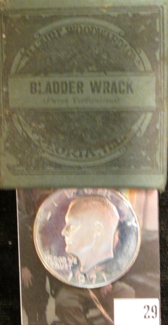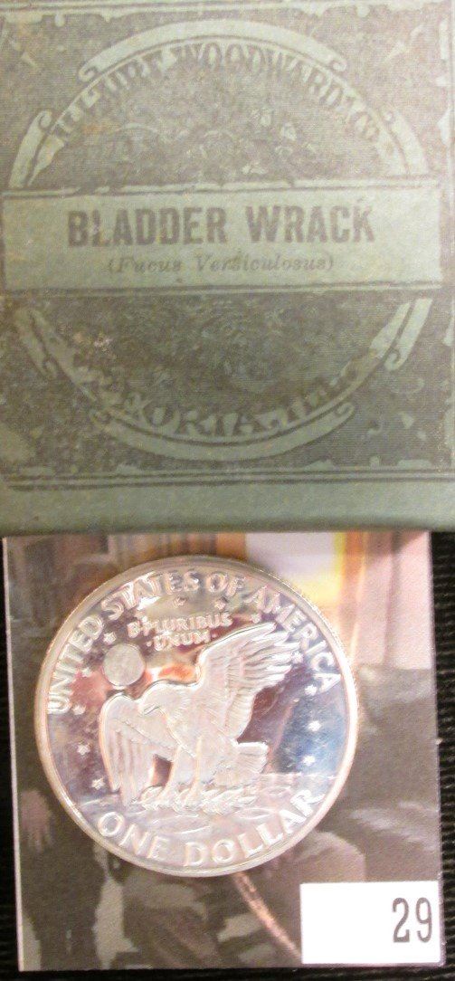 1971S S Silver Proof Eisenhower Dollar; & Original Box with contents "Bladder Wrack (Fucus Vensiculosus) Allaire-Woodward & Co. Peoria-Ill."