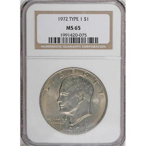 <B>1972 $1 Type One MS65 NGC.</B></I> NGC Census: (0/0). PCGS Population (165/4). Numismedia Wsl. Price: $450. (#87409)<BR><BR><b>Shipping:</b> Coin/Currency (<a target="_blank" href="http://www.heritageauctions.com/common/shipping.php">view shipping information</a>)