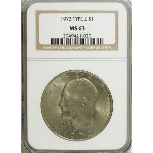 <B>1972 $1 Type Two MS63 NGC.</B></I> NGC Census: (0/0). PCGS Population (0/0). Numismedia Wsl. Price for NGC/PCGS coin in MS63: $170. (#97409)<BR><BR><b>Shipping:</b> Coins & Currency (<a target="_blank" href="http://www.heritageauctions.com/common/shipping.php">view shipping information</a>)