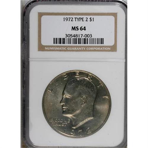<B>1972 $1 Type Two MS64 NGC.</B></I> PCGS Population (208/38). Mintage: 75,890,000. Numismedia Wsl. Price for NGC/PCGS coin in MS64: $500. (#97409)<BR><BR><b>Shipping:</b> Coins & Currency (<a target="_blank" href="http://www.heritageauctions.com/common/shipping.php">view shipping information</a>)