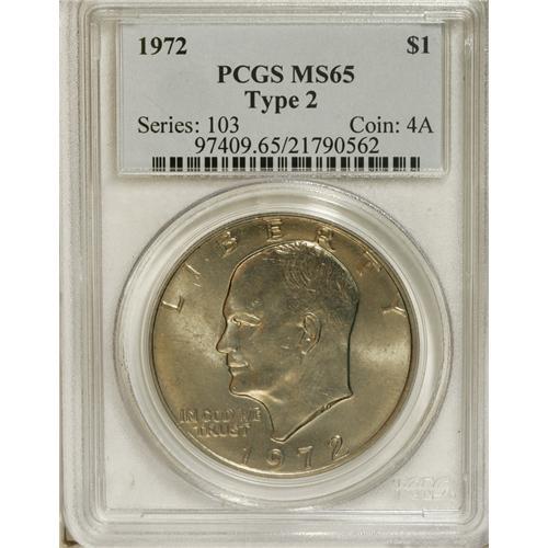 <B>1972 $1 Type Two MS65 PCGS.</B></I> An even veil of pale golden patina drapes the shining surfaces of this Type Two 1972 dollar, distinguished by a high-relief design with indistinct islands on the Earth on the reverse. The 1972 Type Two is a key to the series. While the obverse is clean for the grade, a single abrasion is noted at the eagle's neck. Population: 30 in 65, 5 finer (4/07).<BR><BR><b>Shipping:</b> Coins & Currency (<a target="_blank" href="http://www.heritageauctions.com/common/shipping.php">view shipping information</a>)