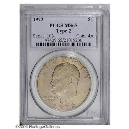 <B>1972<$1> Type Two MS65 PCGS.</B></I> In researching our data base, we find this is the first offering of a Gem 1972 Type Two Ike Dollar. The pastel-golden surfaces are well defined with no mentionable marks or other abrasions or spots. An important opportunity for the Ike Dollar enthusiast. Population: 22 in 65, 4 finer (12/05).
