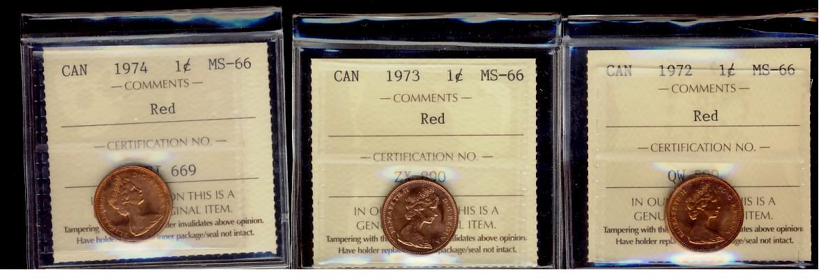 1972 & 1973 & 1974 1¢ ICCS MS66RD. Lot of 3 coins.