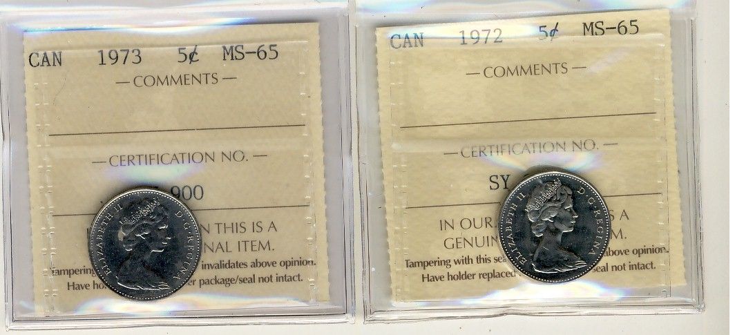 1972, 1973 5 Cents, ICCS MS65; Two coins.
